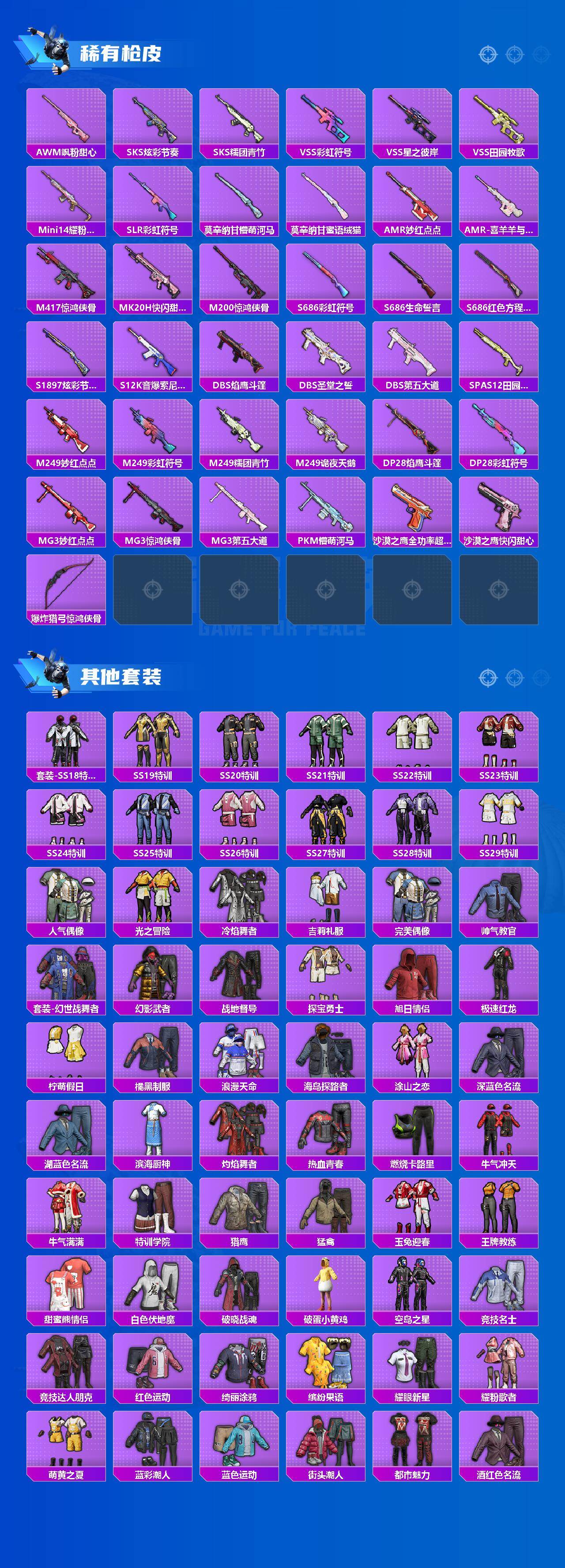 【粉色枪皮等级】:AKM-绿萝繁花(五级),SCAR-L-锦绣绵绵(五级),M416-电玩时刻(五级),UMP45-量子极限(五级),Vector-飒粉甜心(七级),Kar98K-巳巳如意(五级),DP-28-豹影疾电(五级)