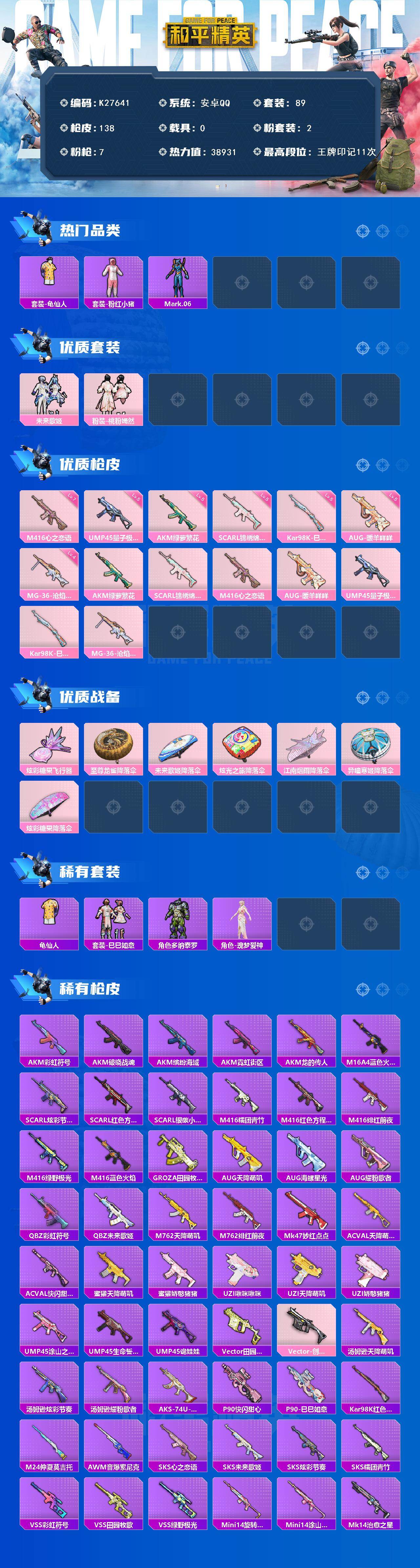 安卓 手Q-2粉装-7特效枪-0载具-1粉色飞行器-38931热力值-11王牌印记-89套装-138枪皮