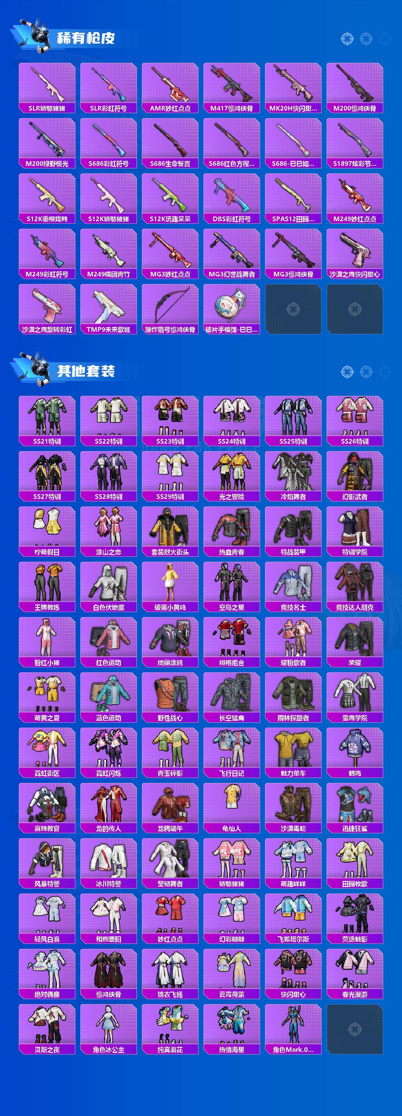 【粉色枪皮等级】:AKM-绿萝繁花(五级),SCAR-L-锦绣绵绵(五级),M416-心之恋语(七级),AUG-暖羊咩咩(五级),UMP45-量子极限(五级),Kar98K-巳巳如意(五级),MG-36-沧焰双生(四级)