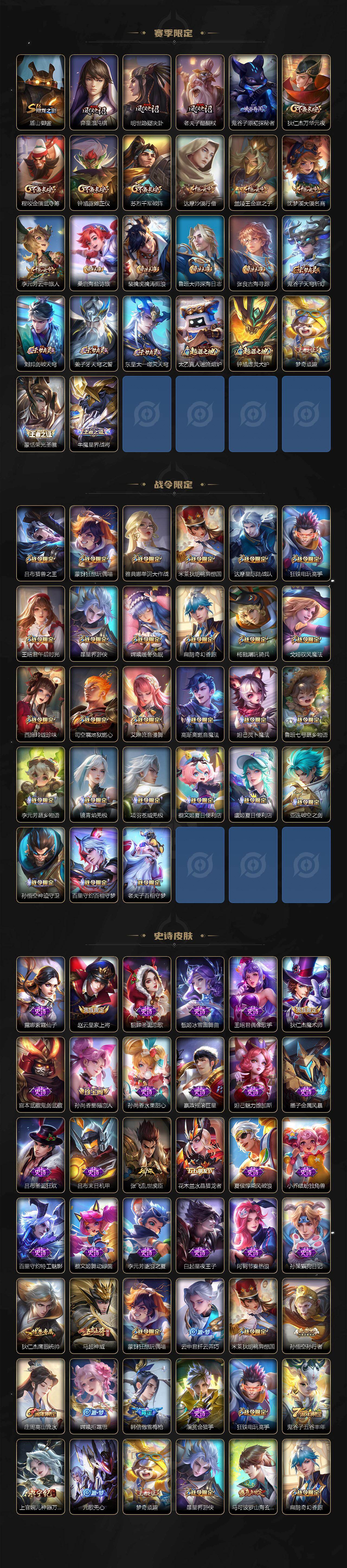 【限定皮肤】:蔡文姬夏日便利店,大乔绒语心约,虞姬夏日便利店,姜子牙天穹之誓,狄仁杰阴阳师,赵云皇家上将,孙尚香蔷薇恋人,庄周高山流水,扁鹊奇幻香