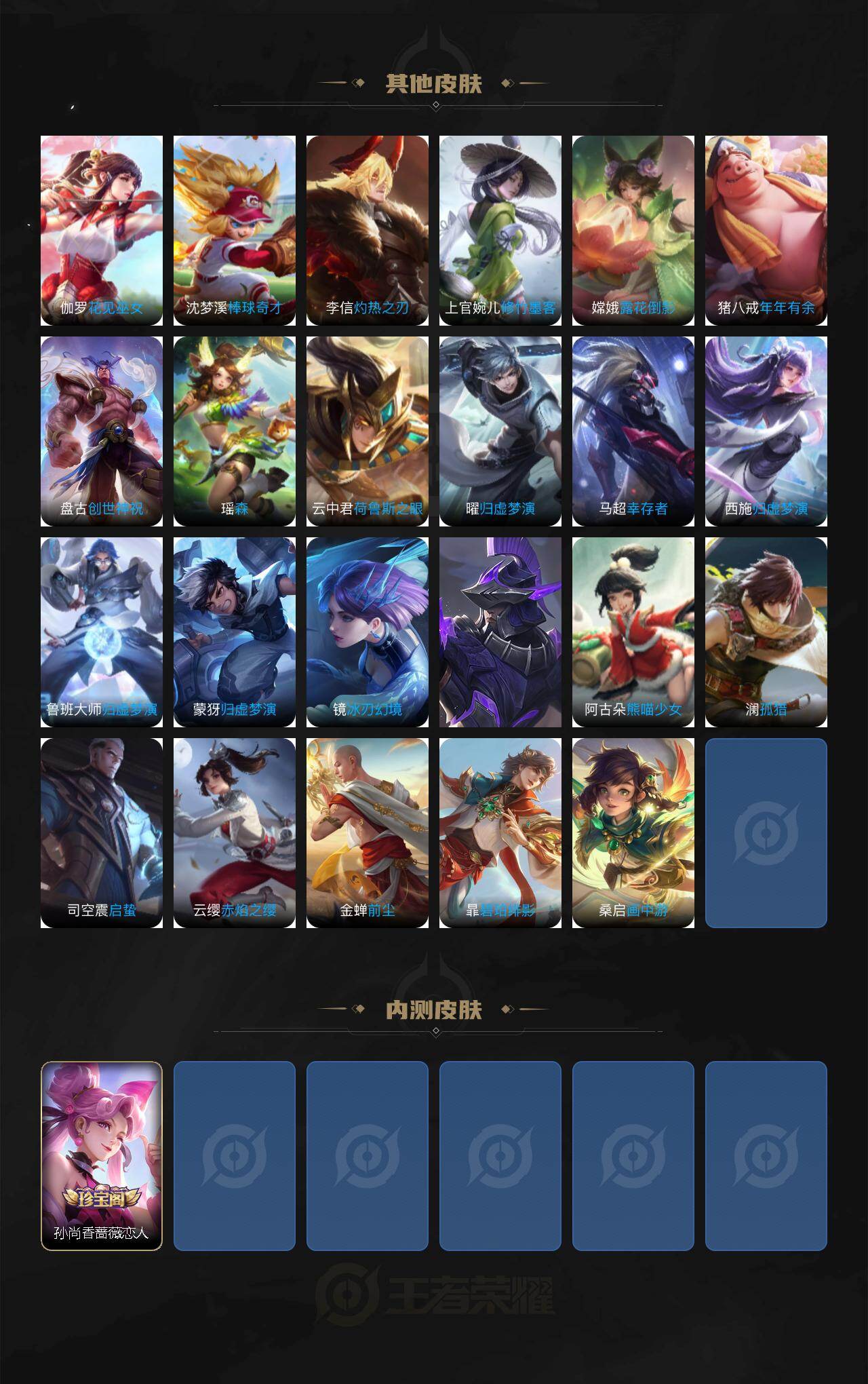 【传说皮肤】:澜愿照九州拓,裴擒虎祥瑞亨通,桑启鸣野蒿,亚连落雪白狼,典韦战鼓燎原,孙策乘龙淬吴钩,澜逐花归海,澜电玩雷克斯,曜山海苍雷引,李白诗剑行,马超无双飞将,镜炽阳神光,梦奇胖达荣荣,孙尚香末日机甲