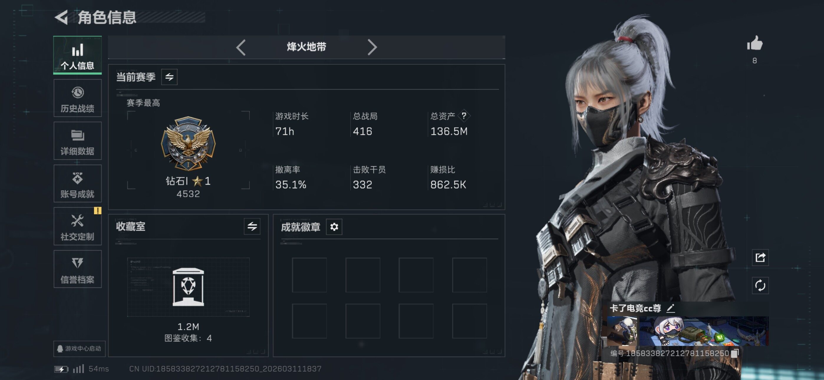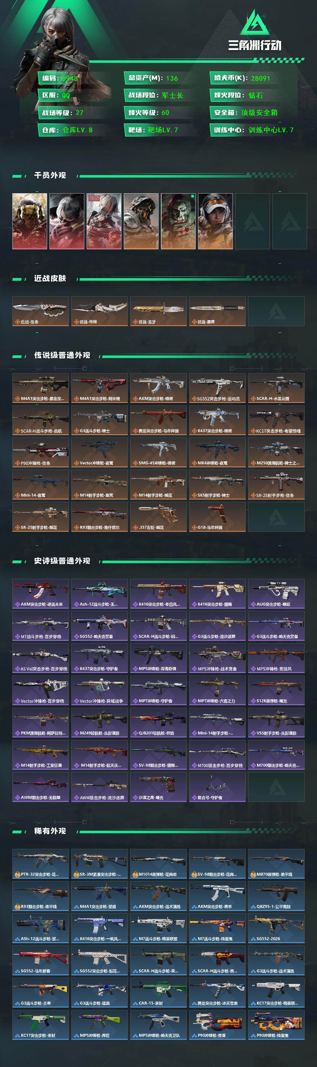 {特价出售}等级:60总资产:136.5M 纯币28091k 隐藏挂饰:1s黑夜猎手 红皮:蚀金玫瑰 水墨云图 维什戴尔 刀皮 怜悯 龙牙 信条 特勤处:仓库8,训练7,靶场7 部门33333 深蓝-不破誓约,红狼-电锯惊魂,露娜-金牌射手
