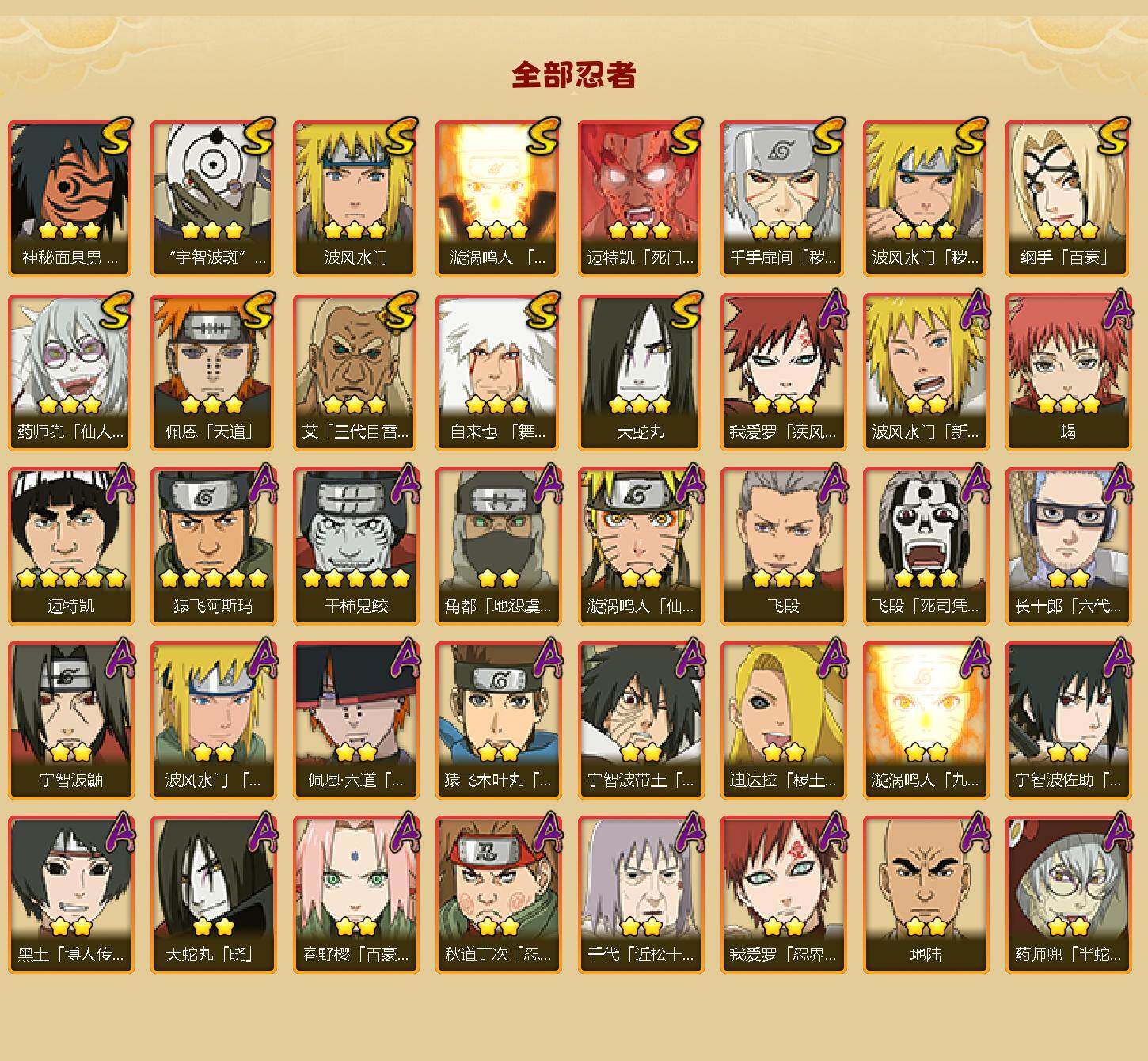 【S级忍者】:波风水门「秽土转生」(3星),千手扉间「秽土转生」(3星),艾「三代目雷影」(3星),自来也「舞之豪杰」(3星),大蛇丸(3星),纲手「百豪」(3星),波风水门(3星),药师兜「仙人模式」(3星),神秘面具男「红夜之刃」(3星),漩涡鸣人「九喇嘛连结」(3星),迈特凯「死门」(3星),佩恩「天道」(3星),宇智波斑 「白面具」(3星宇智波斑「白面具」)