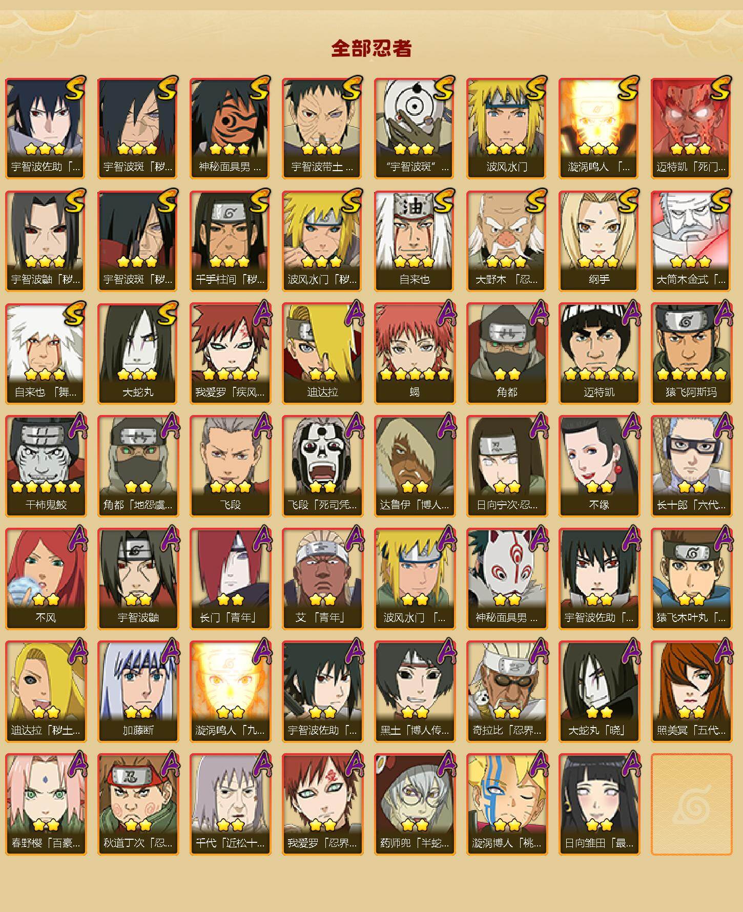 【S级忍者】:波风水门「秽土转生」(3星),千手柱间「秽土转生」(3星),宇智波鼬「秽土转生」(3星),宇智波斑「秽土转生」(3星),宇智波斑「秽土转生·解」(3星),大野木「忍界大战」(3星),宇智波带土「忍界大战」(3星),自来也(3星),自来也「舞之豪杰」(3星),大蛇丸(3星),纲手(3星),波风水门(3星),神秘面具男「红夜之刃」(3星),漩涡鸣人「九喇嘛连结」(3星),迈特凯「死门」(3星),宇智波佐助「永恒万花筒」(3星),宇智波斑 「白面具」(3星