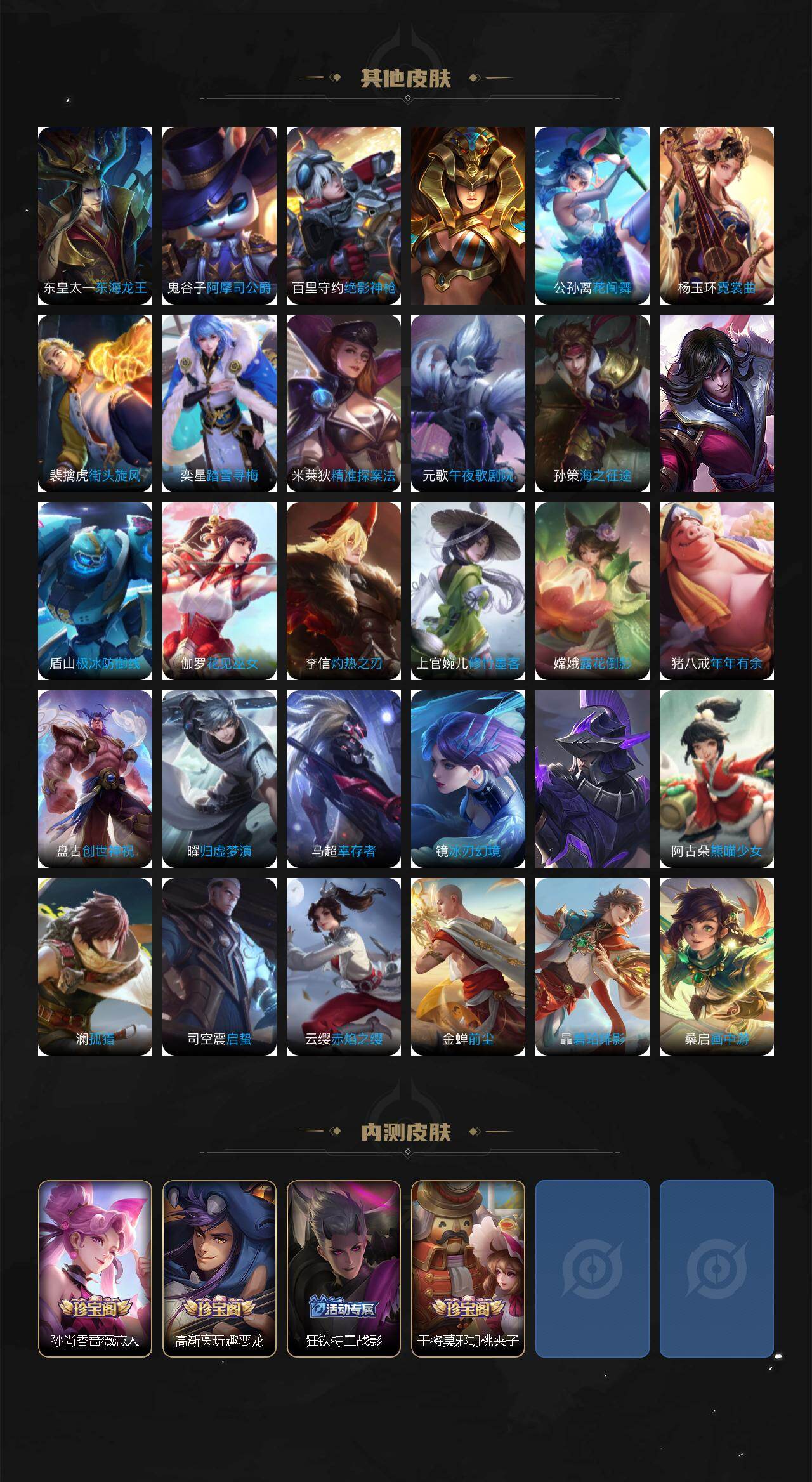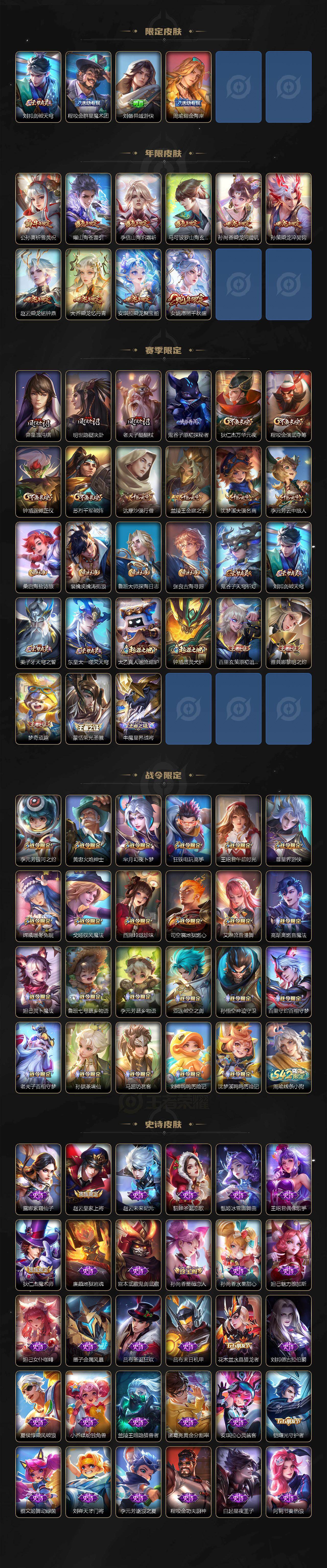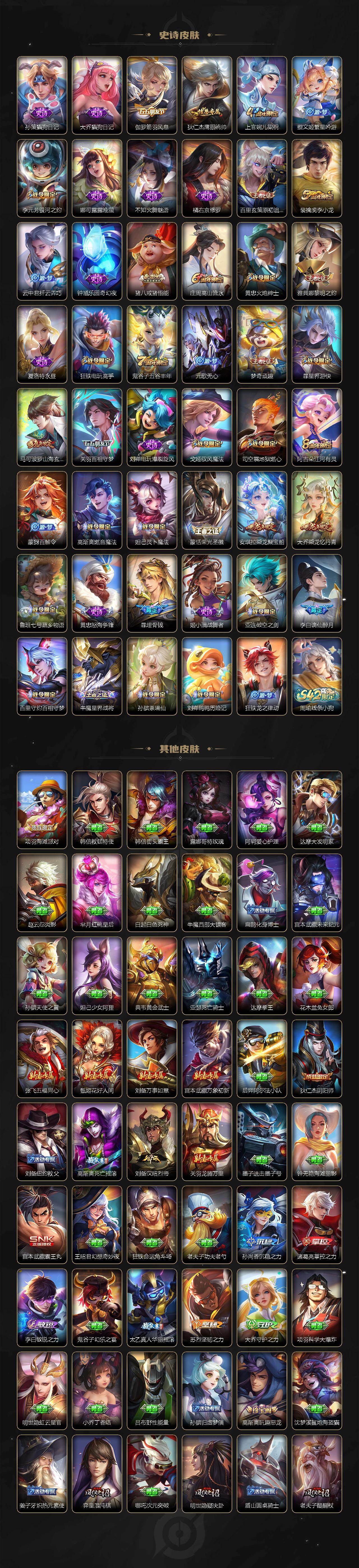 【传说皮肤】:女娲愿照千秋盛,云缨幻光神枪,桑启鸣野蒿,孙尚香乘龙问璇玑,孙策乘龙淬吴钩,赵云乘龙铭钟鼎,澜逐花归海,澜电玩雷克斯,孙悟空齐天大圣,曜山海苍雷引,李信山海炽霜斩,吕布怒海麟威,马可波罗深海之息,马超无双飞将,公孙离祈雪灵祝,镜炽阳神光,虞姬启明星使,李信一念神魔,宫本武藏地狱之眼,狄仁杰超时空战士