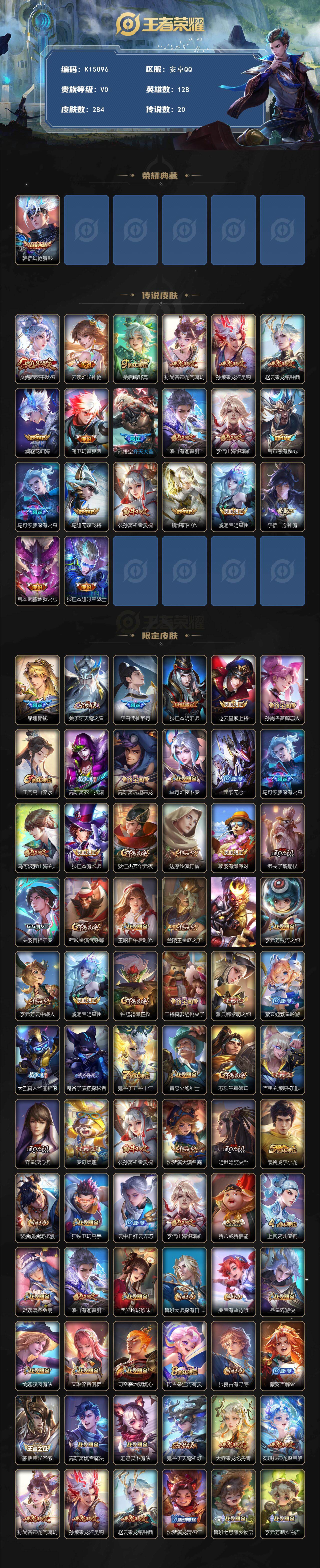 安卓Q-V0-至尊星耀III段位-128英雄-284皮肤-1典藏皮肤-20传说-76史诗
