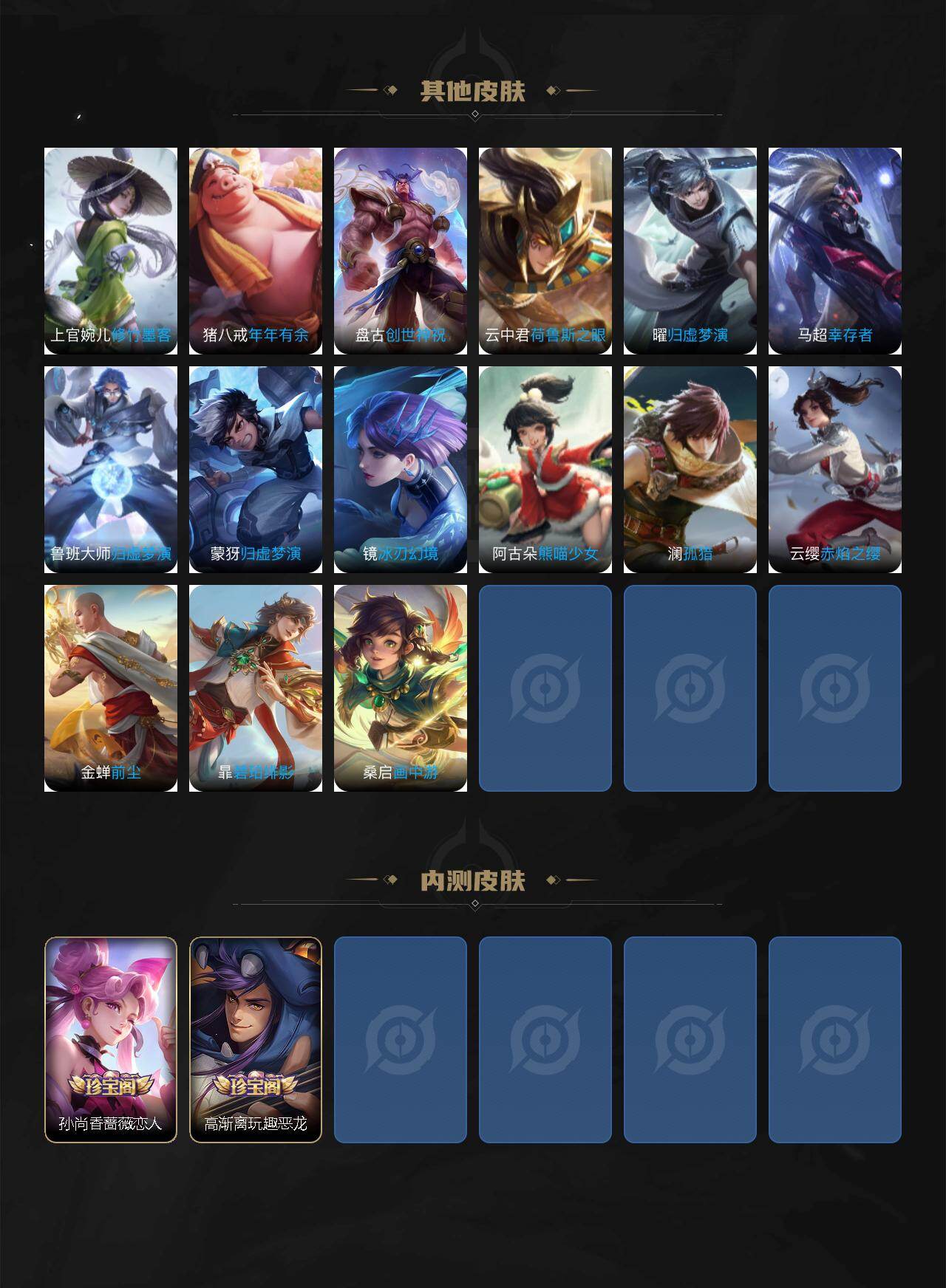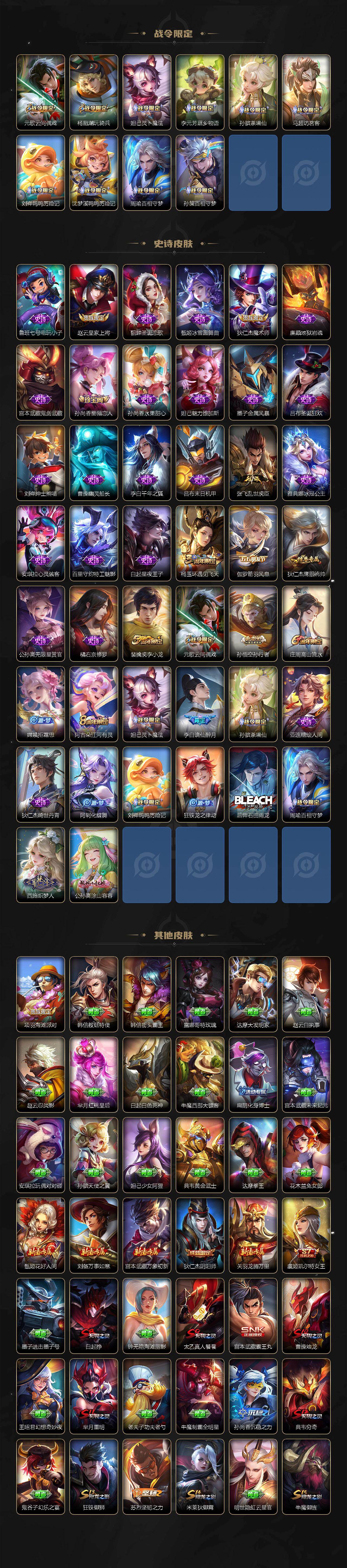 【限定皮肤】:白起狰,姜子牙天穹之誓,李白谪仙醉月,狄仁杰阴阳师,虞姬凯尔特女王,赵云皇家上将,孙尚香蔷薇恋人,庄周高山流水,高渐离玩趣恶龙,芈月重明,元歌云间偶戏,夏侯惇朔风刀,曹操烛龙,典韦穷奇,狄仁杰魔术师,狄仁杰万华元夜,达摩沙漠行僧,项羽海滩派对,老夫子