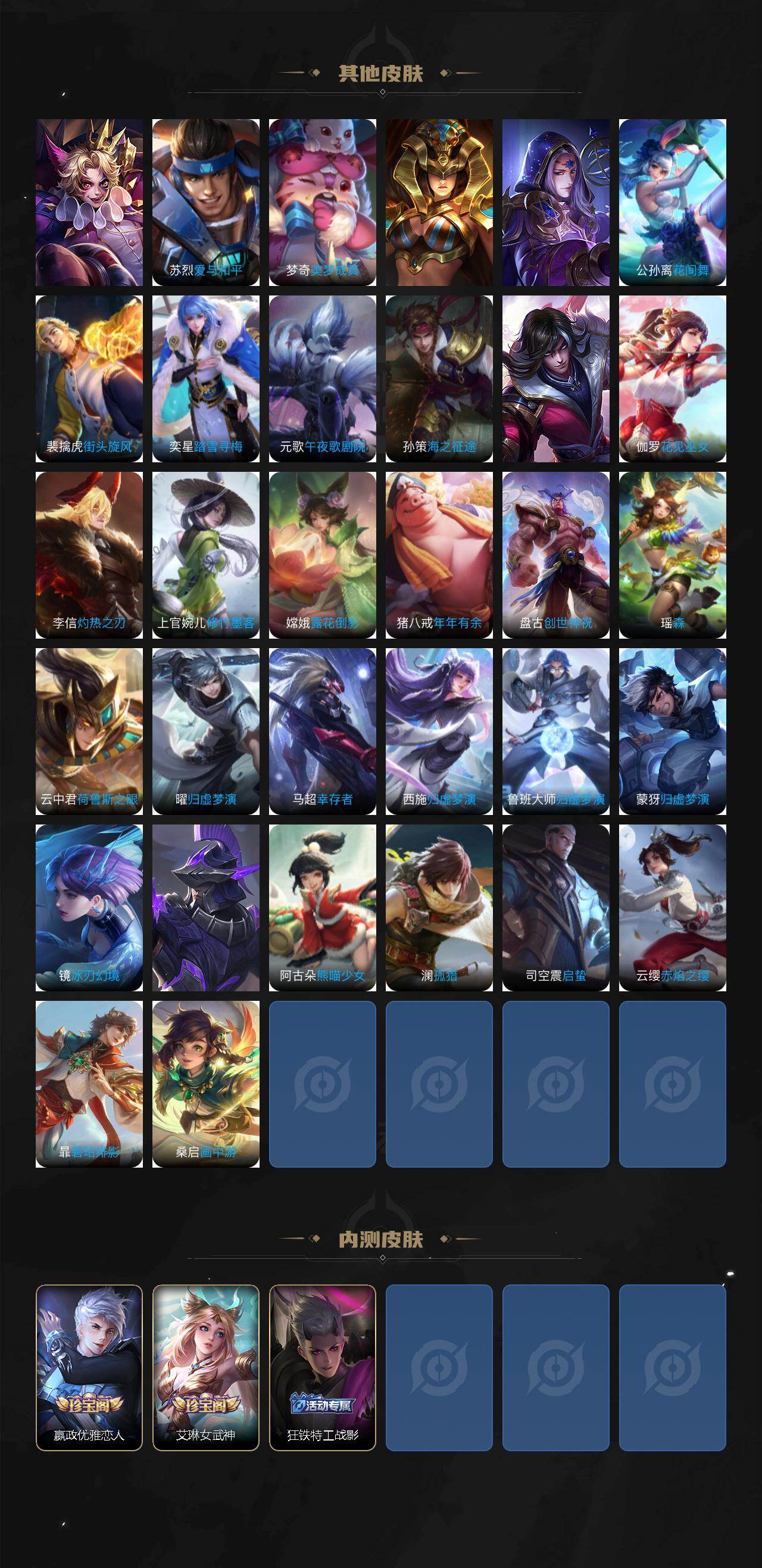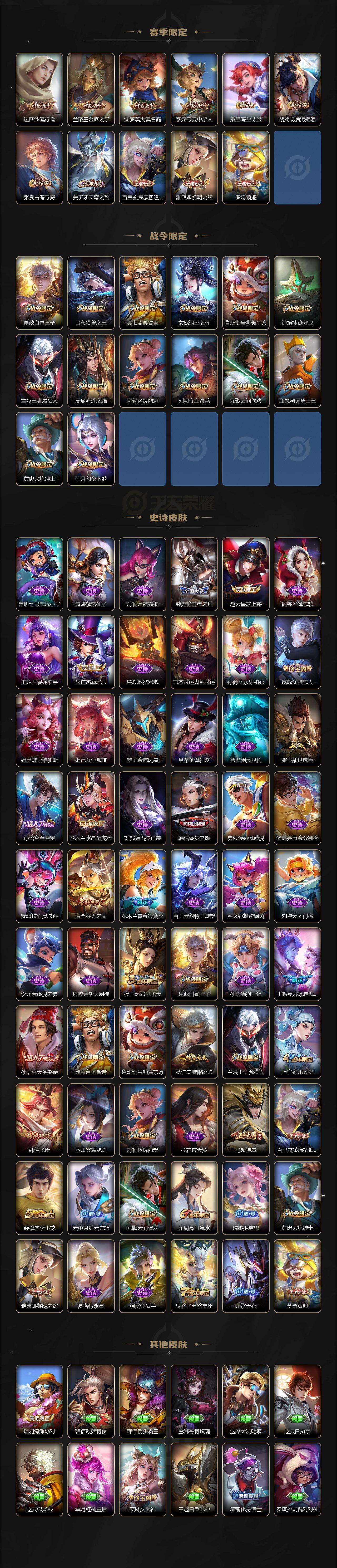【限定皮肤】:姜子牙天穹之誓,狄仁杰阴阳师,赵云皇家上将,嬴政优雅恋人,嬴政白昼王子,鲁班七号狮舞东方,庄周高山流水,阿轲迷踪丽影,钟无艳王者之锤,芈月幻夜卜梦,吕布猎兽之王,周瑜赤莲之焰,元歌云间偶戏,元歌