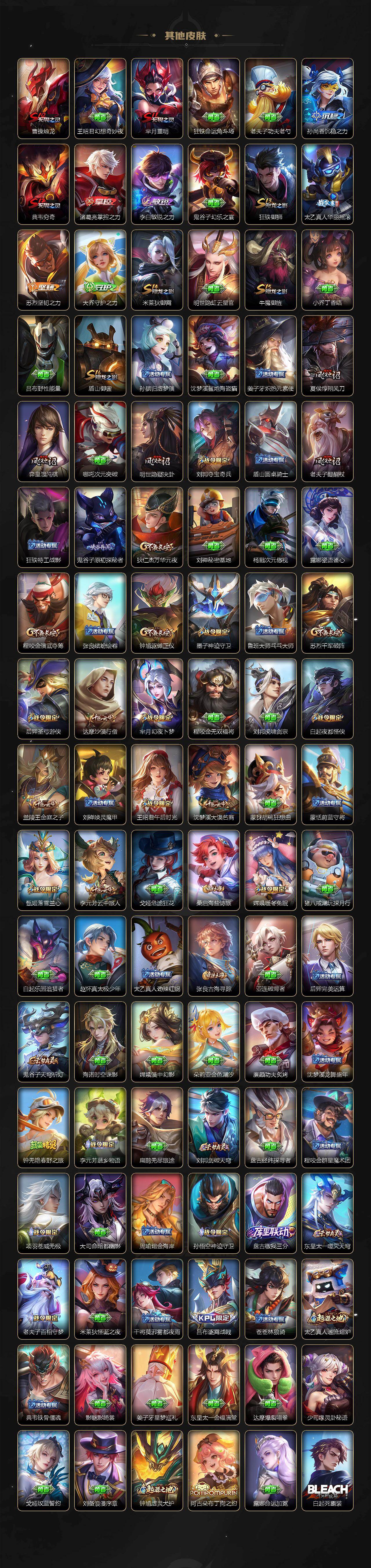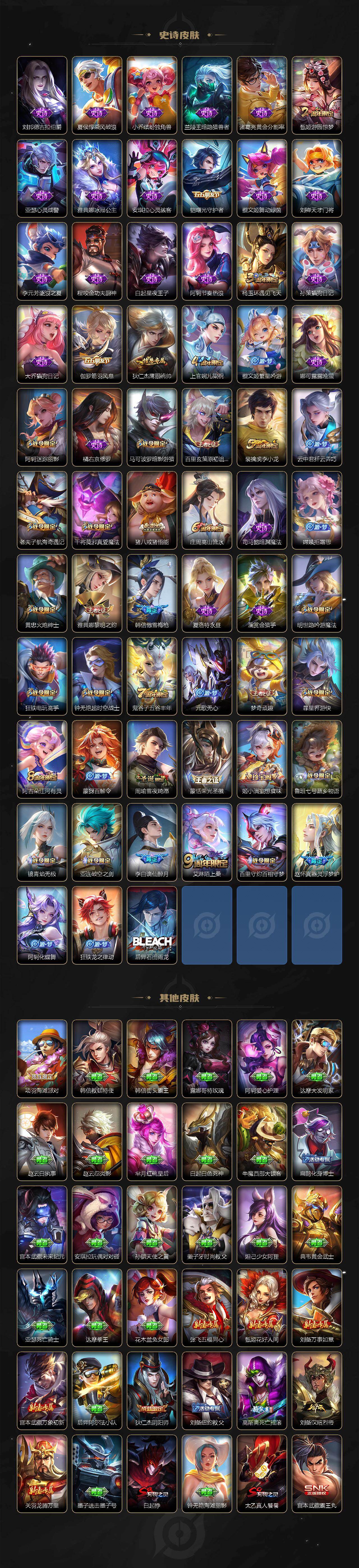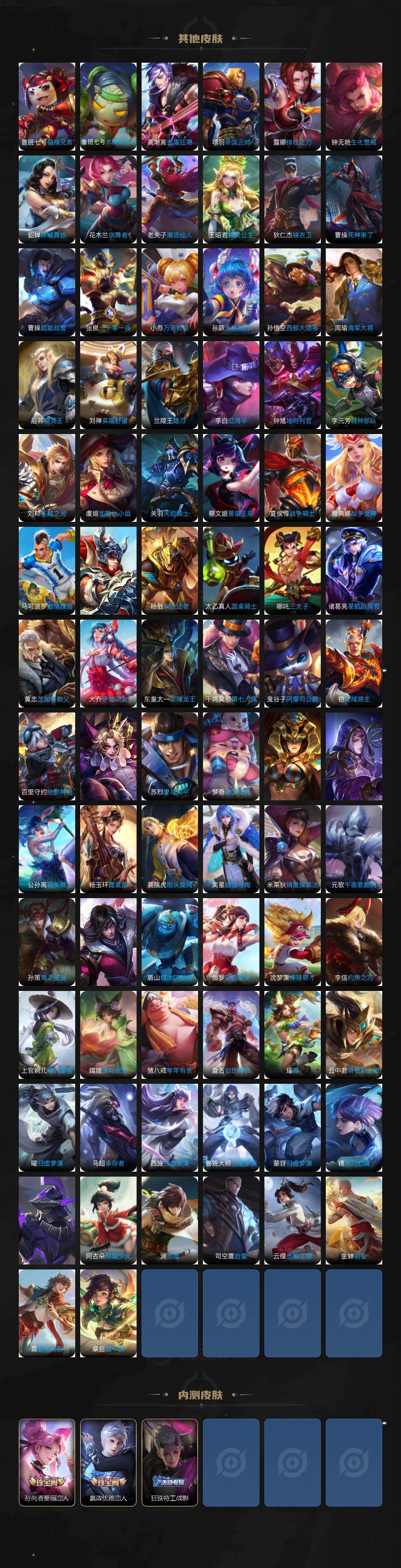 【限定皮肤】:白起狰,李白谪仙醉月,狄仁杰阴阳师,赵云皇家上将,墨子神迹守卫,嬴政优雅恋人,孙尚香蔷薇恋人,庄周高山流水,