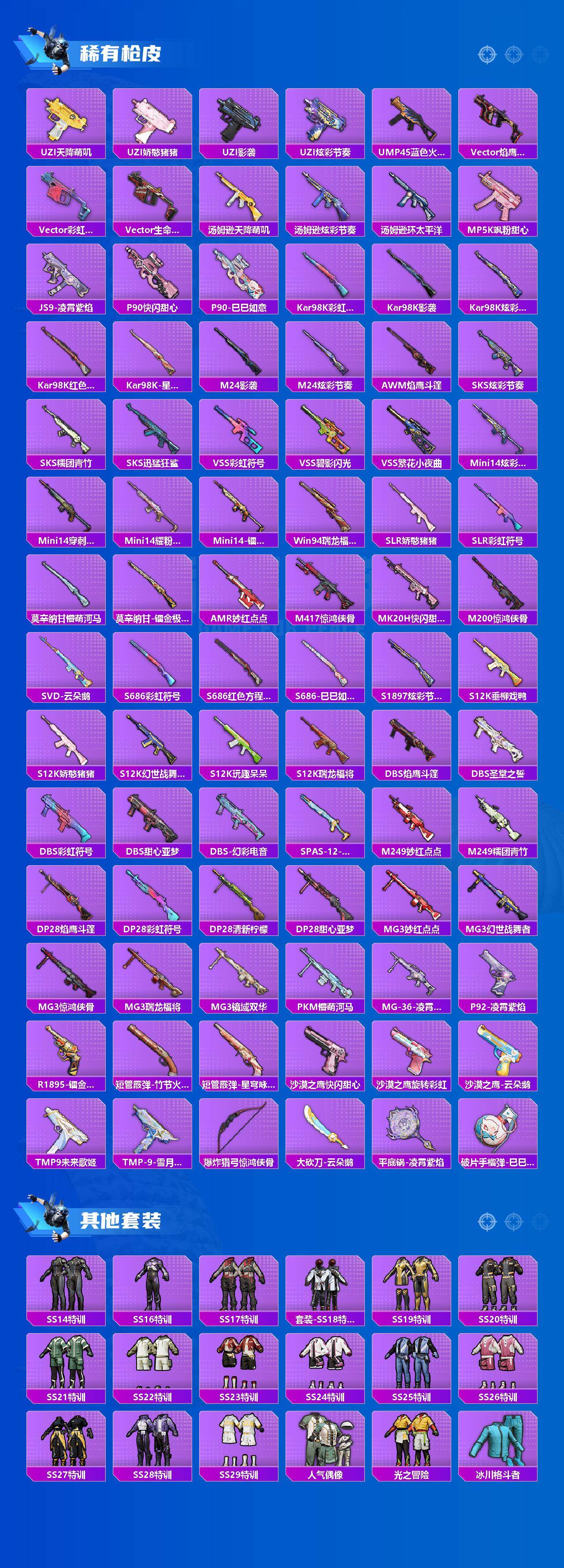 【粉色枪皮等级】:M416-心之恋语(七级),M416-电玩时刻(五级),M762-鬼刀(七级),UMP45-量子极限(五级),Kar98K-巳巳如意(五级),DP-28-豹影疾电(五级)