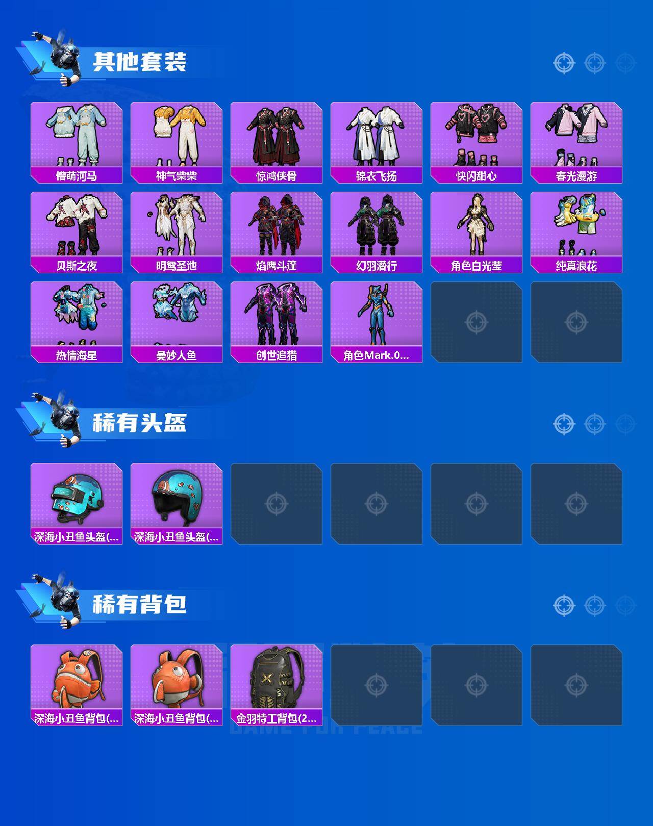 【热门品类】:套装-浪漫天命,套装-深海小丑鱼,套装-小丑鱼,套装-奇异狩猎者,套装-龟仙人,套装-粉红小猪,角色-Mark.06