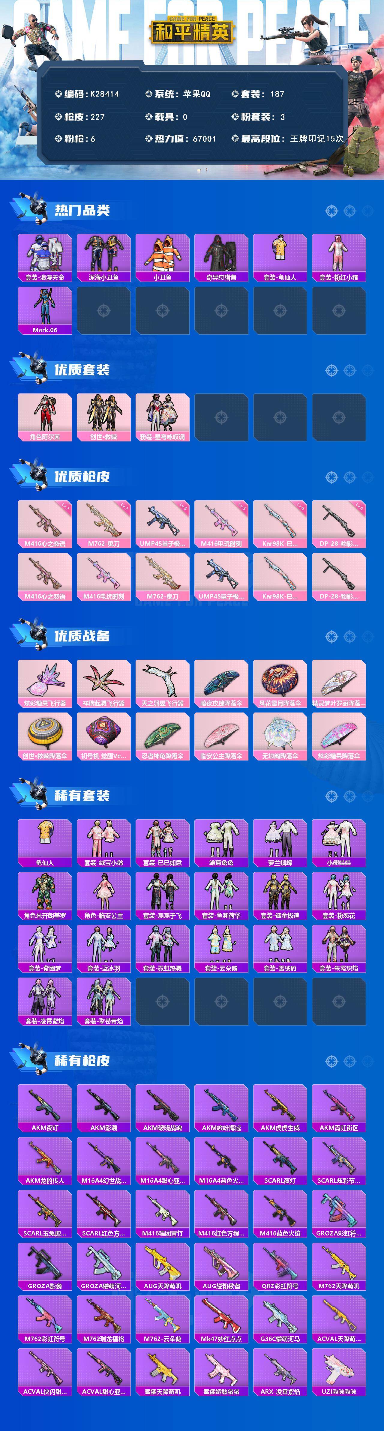 苹果 手Q-3粉装-6特效枪-0载具-3粉色飞行器-67001热力值-15王牌印记-187套装-227枪皮
