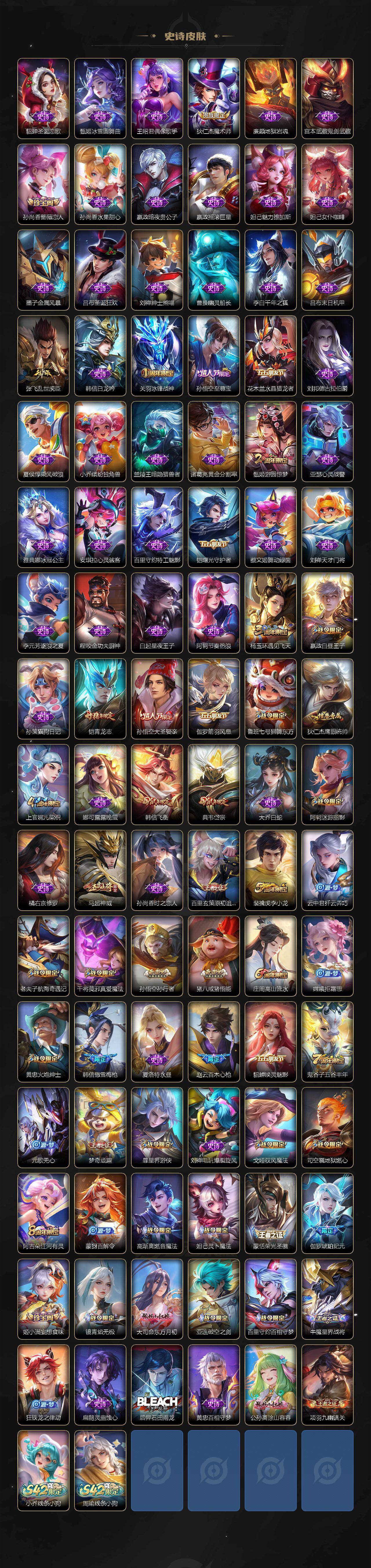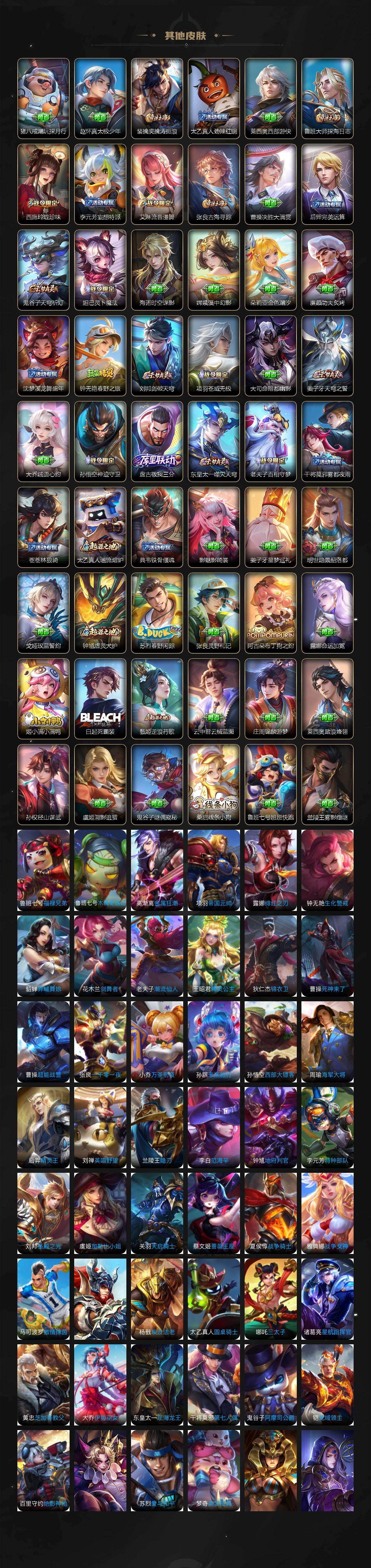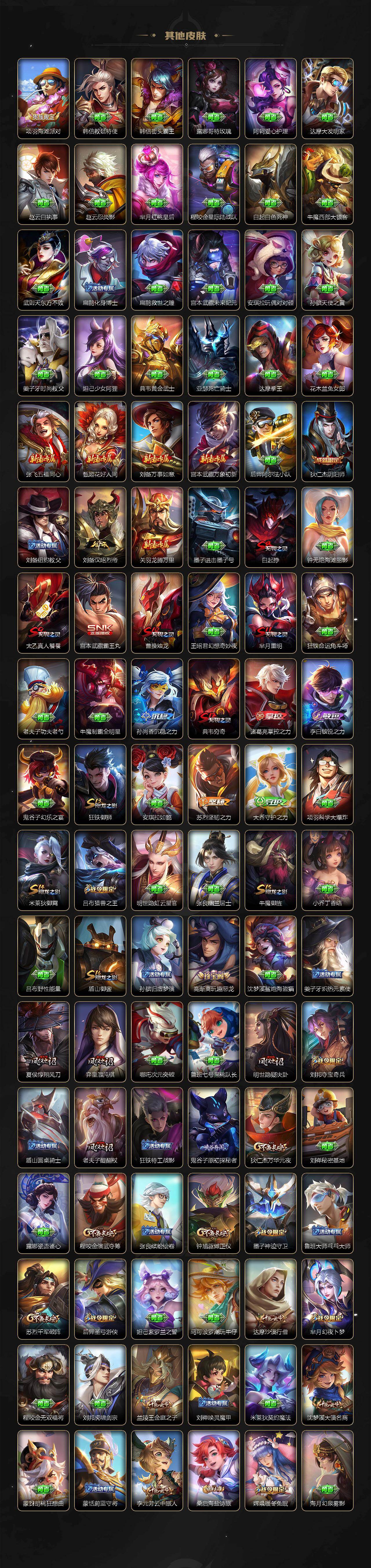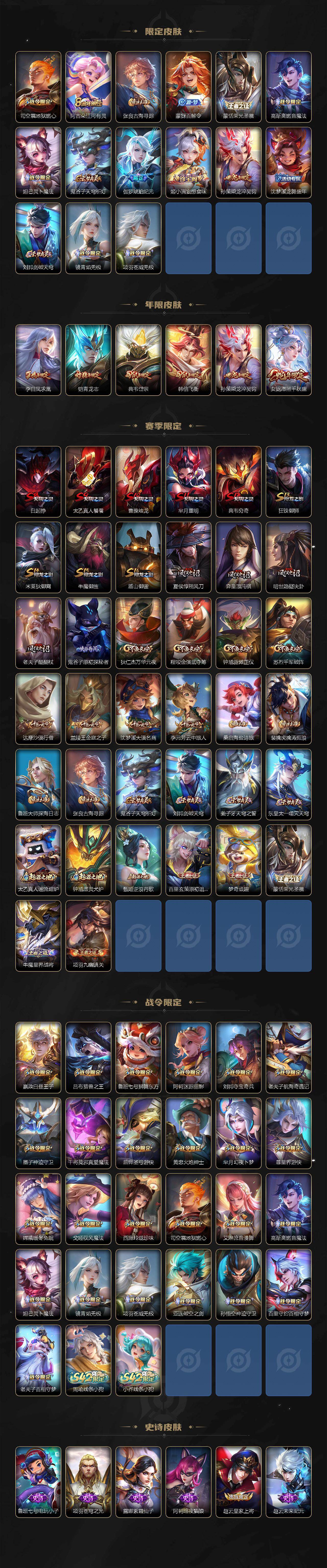 【限定皮肤】:白起狰,大乔绒语心约,姜子牙天穹之誓,狄仁杰阴阳师,赵云皇家上将,赵云百木心枪,墨子
