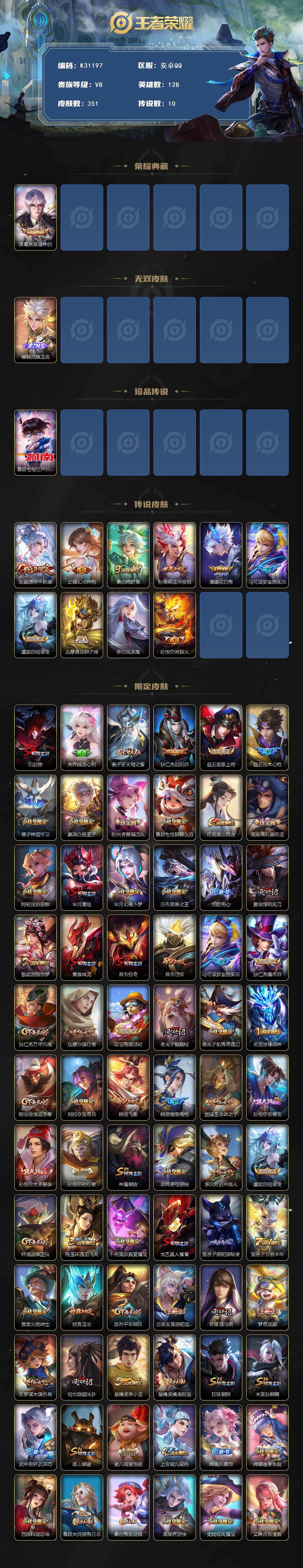 安卓Q-V8-至尊星耀IV段位-128英雄-351皮肤-1典藏皮肤-1无双-1珍品传说-10传说-102史诗