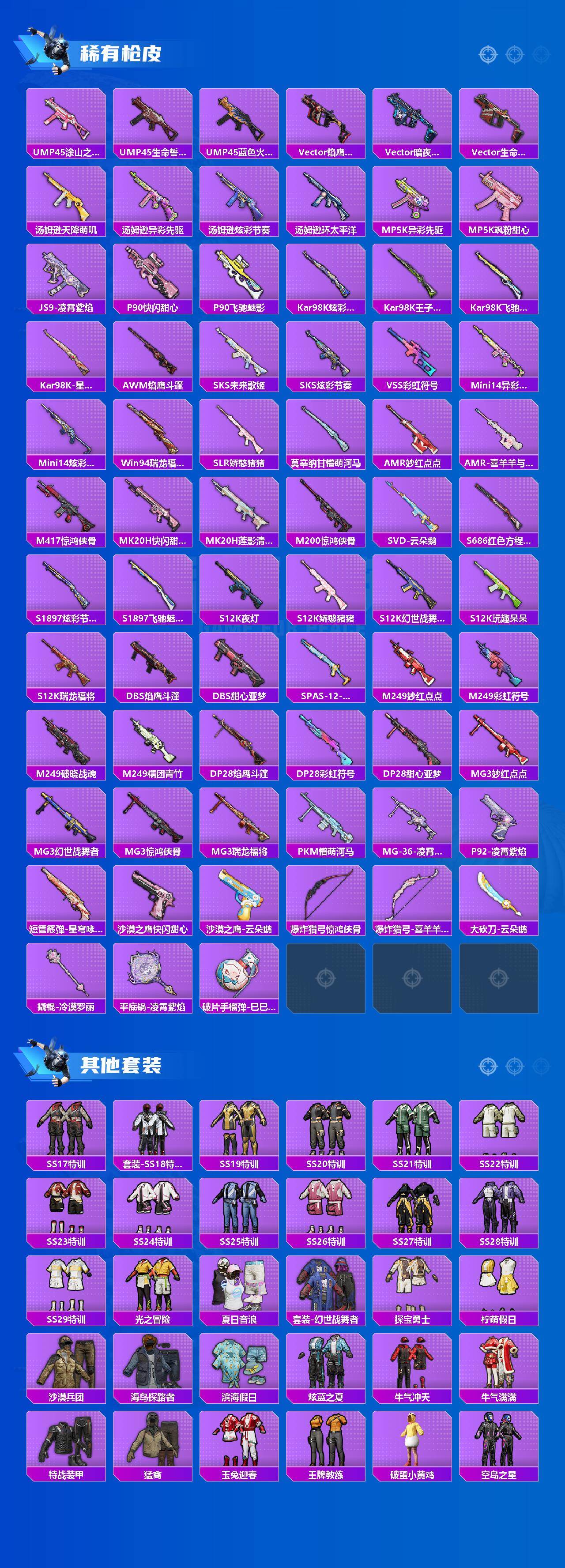 【粉色枪皮等级】:M416-五爪金龙(七级),Vector-环太平洋(七级),Kar98K-巳巳如意(五级),SLR-暗夜玫瑰(七级),AMR-智耀战神(七级),DP-28-豹影疾电(五级)