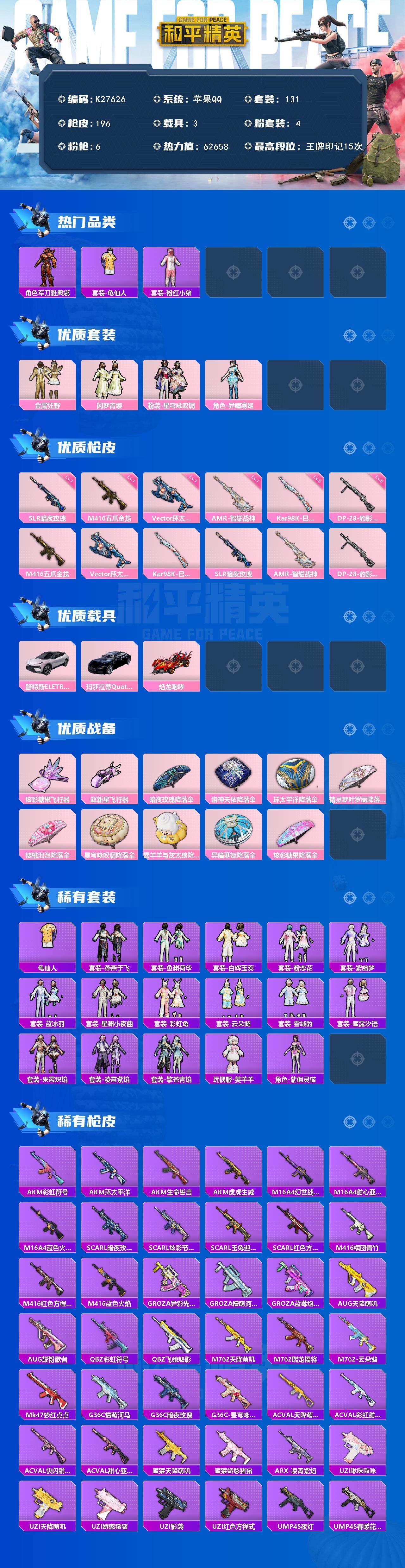 苹果 手Q-4粉装-6特效枪-3载具-2粉色飞行器-62658热力值-15王牌印记-131套装-196枪皮
