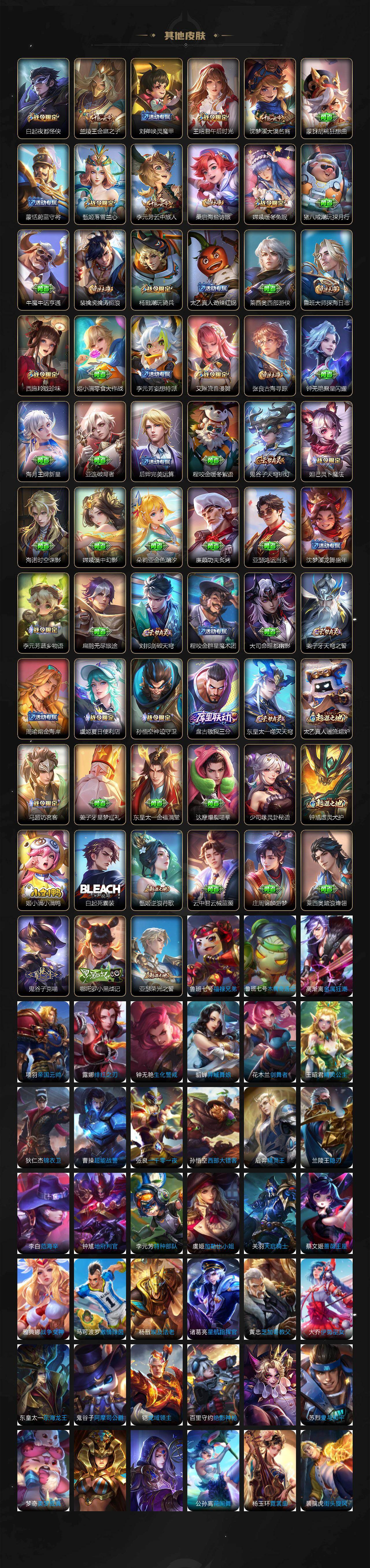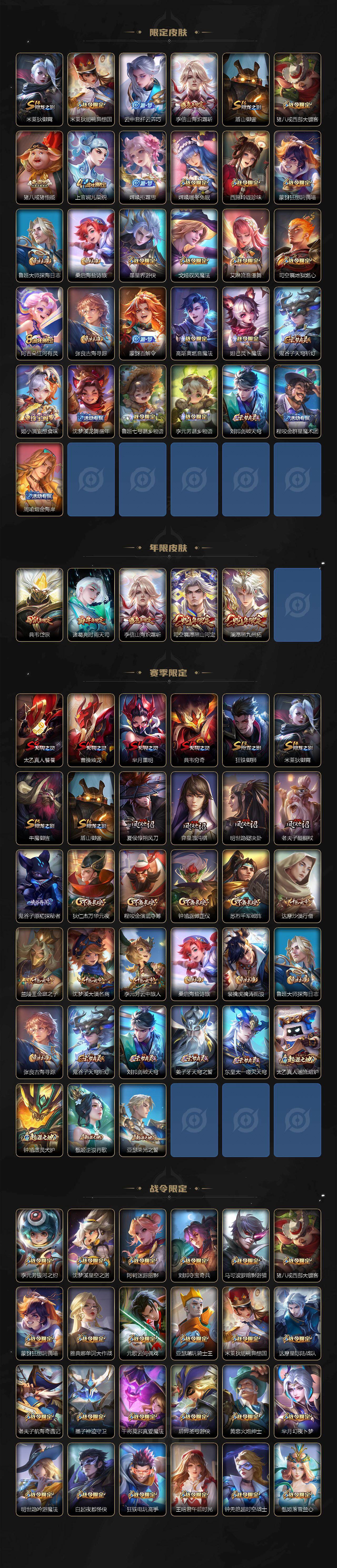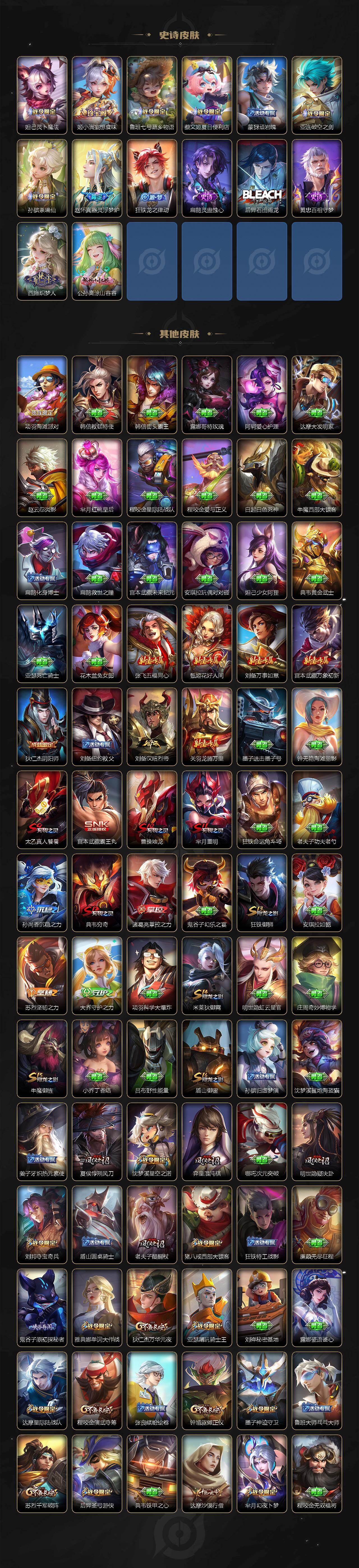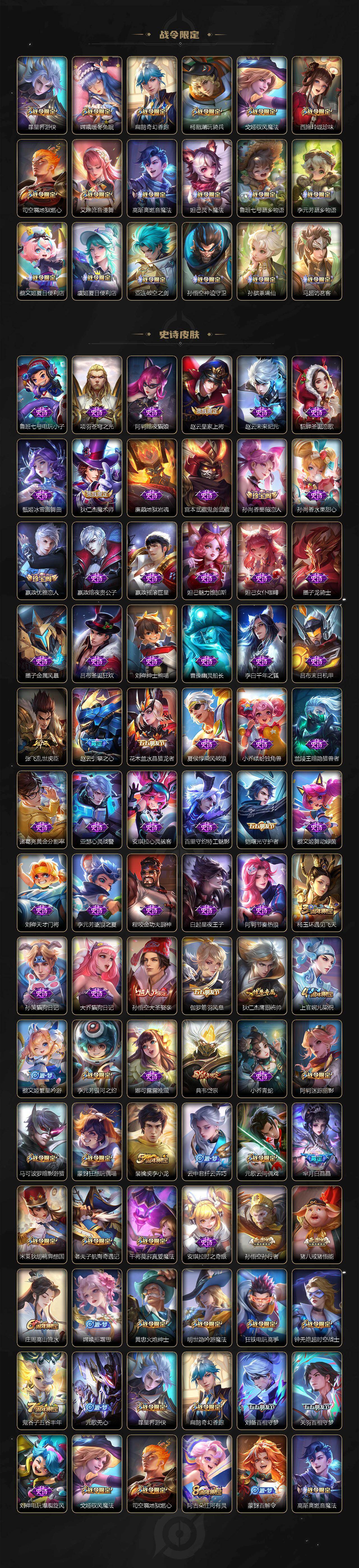 【传说皮肤】:司空震愿照山河定,澜愿照九州拓,云缨幻光神枪,桑启鸣野蒿,诸葛亮鹤羽星尊,张飞百相守梦,孙悟空齐天大圣,李信山海炽霜斩,孙尚香音你闪耀,诸葛亮时雨天司,镜炽阳神光,虞姬启明星使,孙悟空零号赤焰,李信一念神魔,花木兰冠军飞将,貂蝉仲夏夜之梦,宫本武藏地狱之眼,孙悟空地狱火
