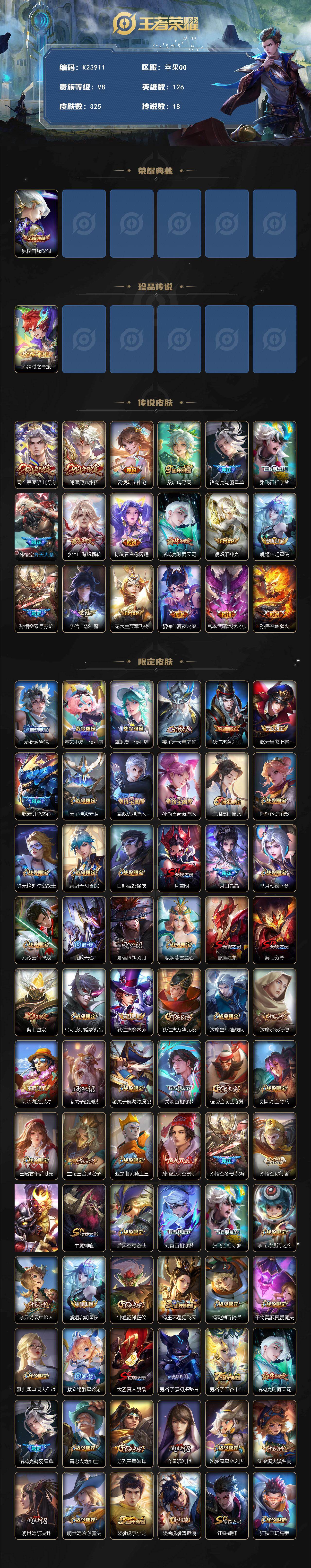 苹果Q-V8-最强王者段位-126英雄-325皮肤-1典藏皮肤-1珍品传说-18