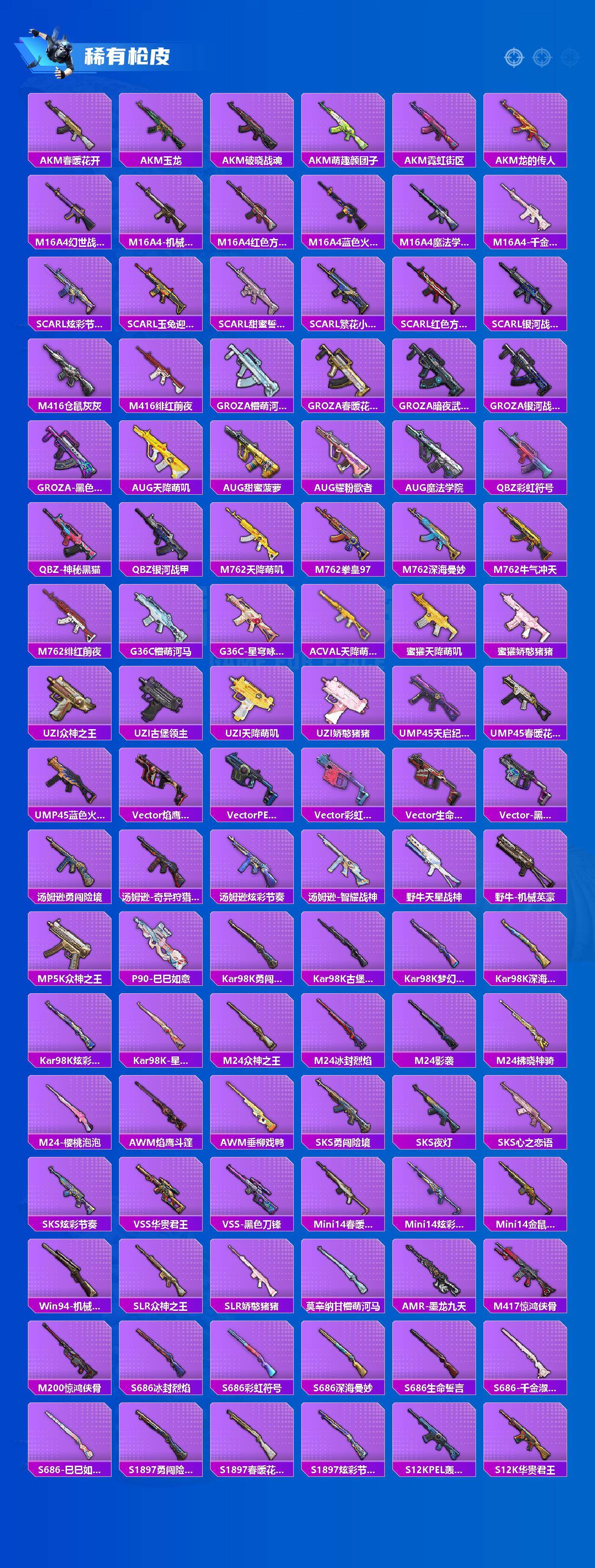 【粉色枪皮等级】:AKM-炫紫旋律(五级),AKM-幽焰骑士(三级),M416-五爪金龙(七级),AUG-暖羊咩咩(五级),M