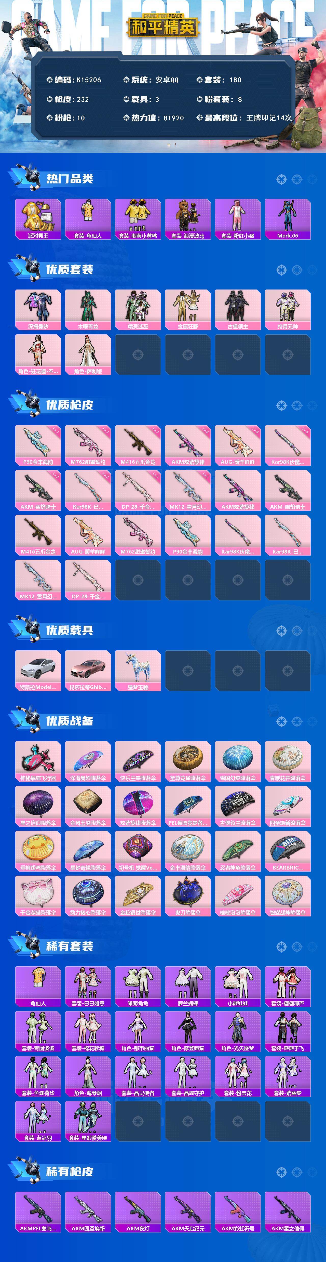 安卓 手Q-8粉装-10特效枪-3载具-1粉色飞行器-81920热力值-14王牌印记-180套装-232枪皮