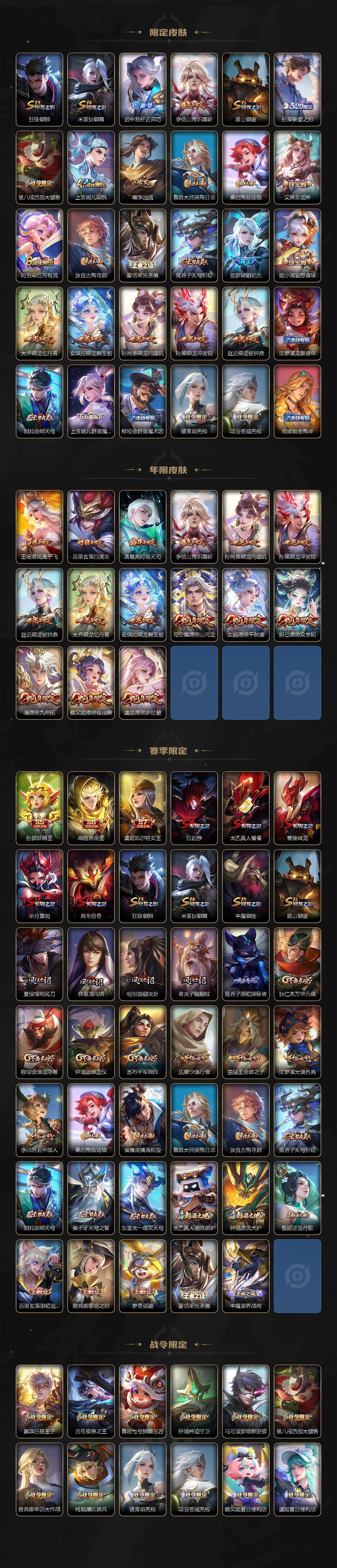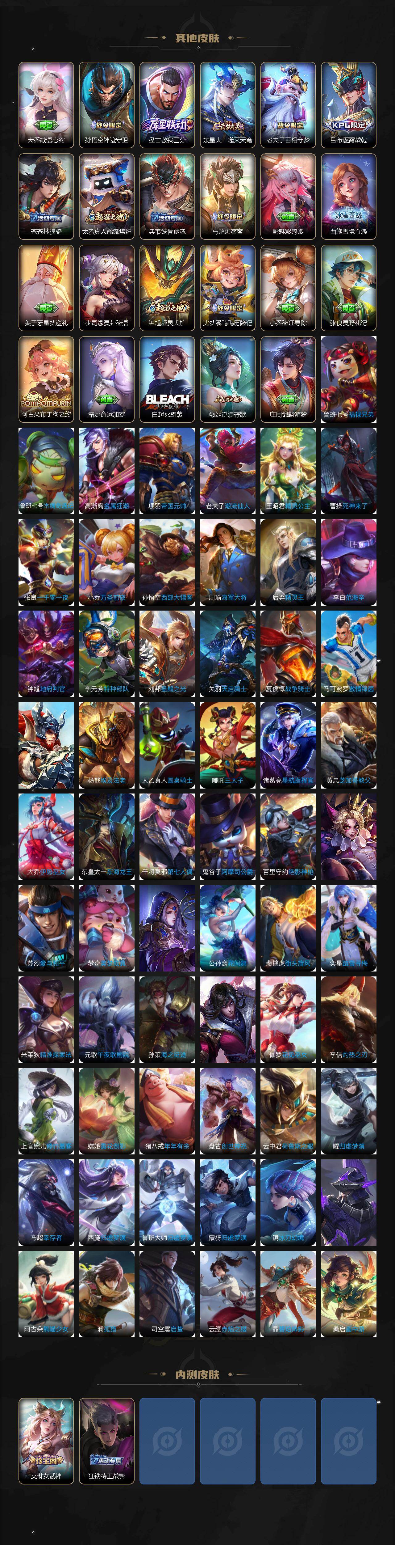 【传说皮肤】:公孙离云诺千山,司空震愿照山河定,女娲愿照千秋盛,妲己愿照众生和,澜愿照九州拓,蔡文姬愿照福禄聚,虞姬愿照岁时盈,云缨幻光神枪,桑启鸣野蒿,孙尚香乘龙问璇玑,孙策乘龙淬吴钩,赵云乘龙铭钟鼎,李信山海炽霜斩,吕布怒海麟威,孙策挚爱之约,曜李逍遥 ,诸葛亮时雨天司,虞姬启明星使,曜云鹰飞将,李信一念神魔,刘备时