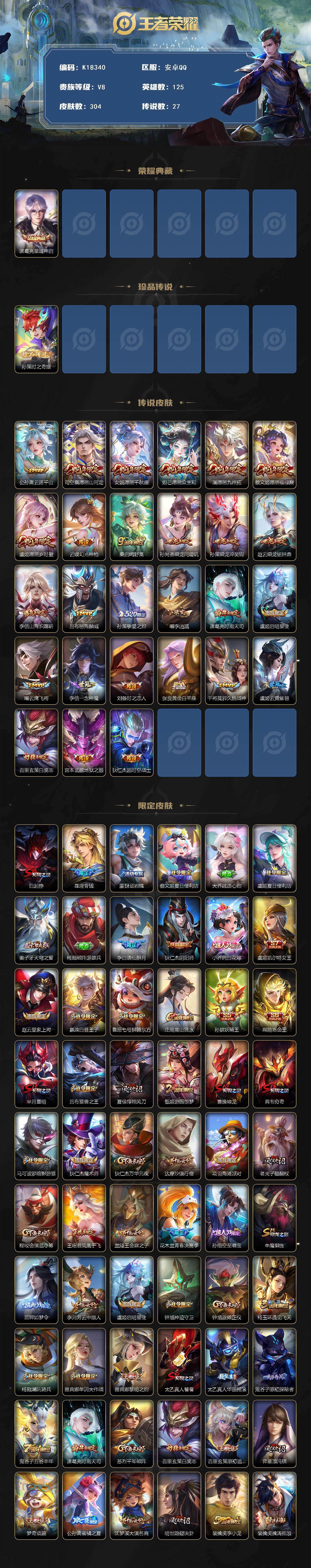 安卓Q-V8-至尊星耀V段位-125英雄-304皮肤-1典藏皮肤-1珍品传说-27传说-83史诗