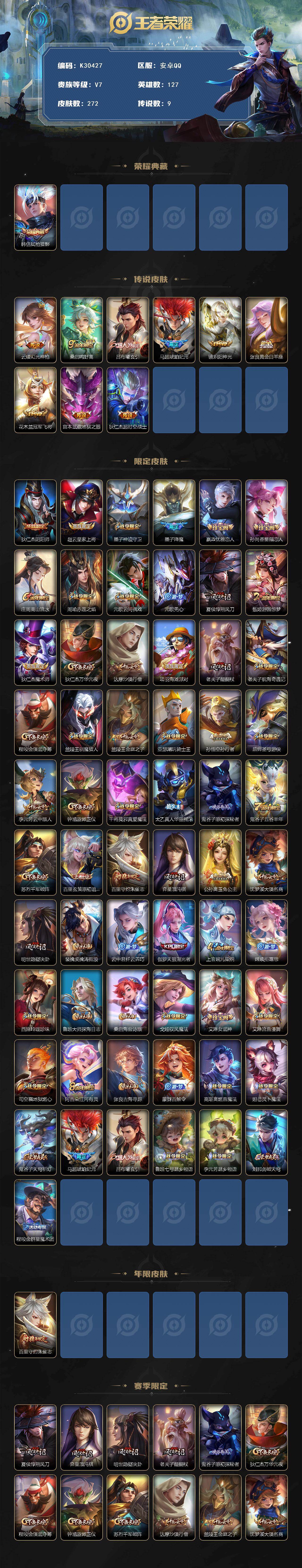安卓Q-V7-永恒钻石IV段位-127英雄-272皮肤-1典藏皮肤-9传说-63史诗