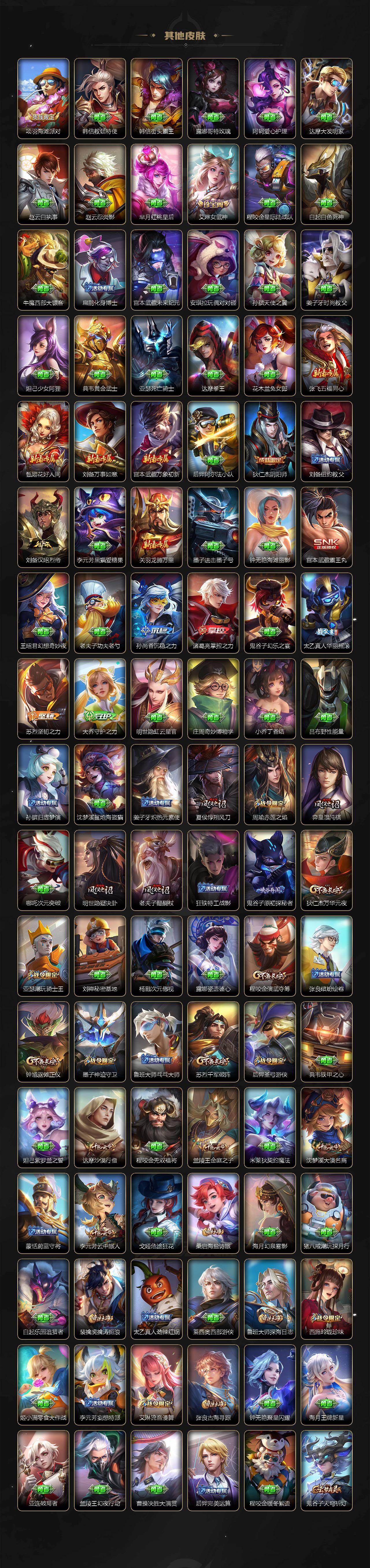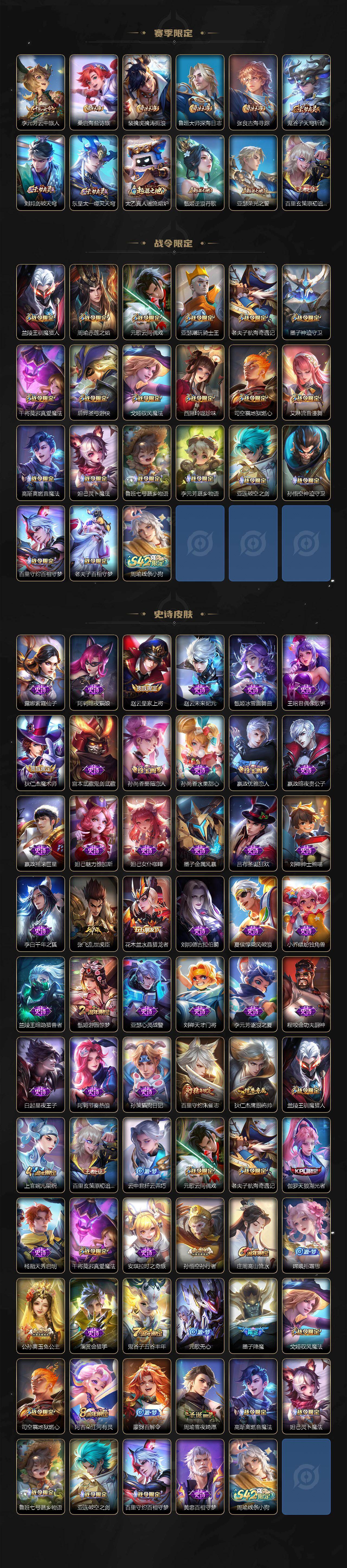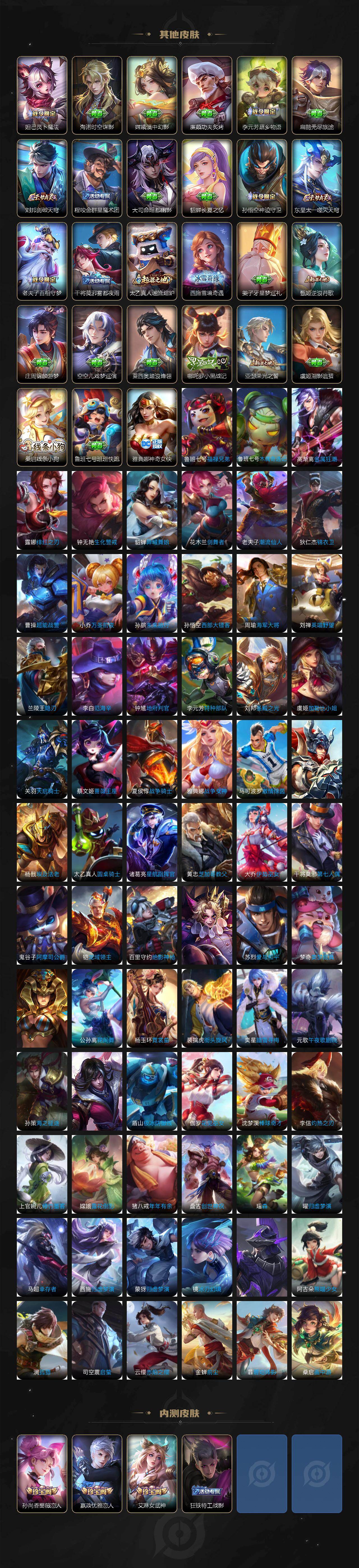 【限定皮肤】:狄仁杰阴阳师,赵云皇家上将,墨子神迹守卫,墨子降魔,嬴政优雅恋人,孙尚香蔷薇恋人,庄周高山流水,周瑜赤莲之焰,元歌云间偶戏,元歌无心,夏侯惇朔风刀,甄姬游园惊梦,狄仁杰魔术师,狄仁杰万华元夜,达摩沙漠