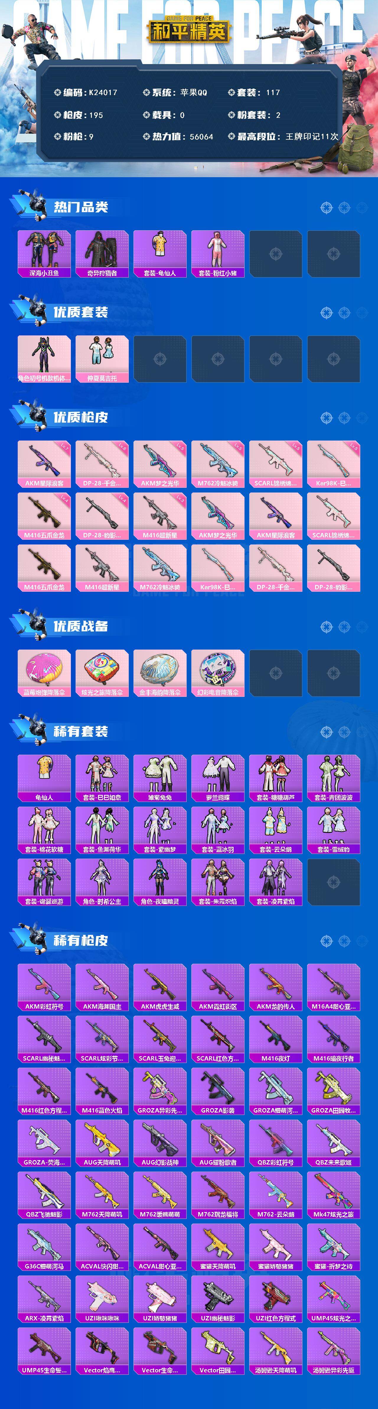 苹果 手Q-2粉装-9特效枪-0载具-0粉色飞行器-56064热力值-11王牌印记-117套装-195枪皮