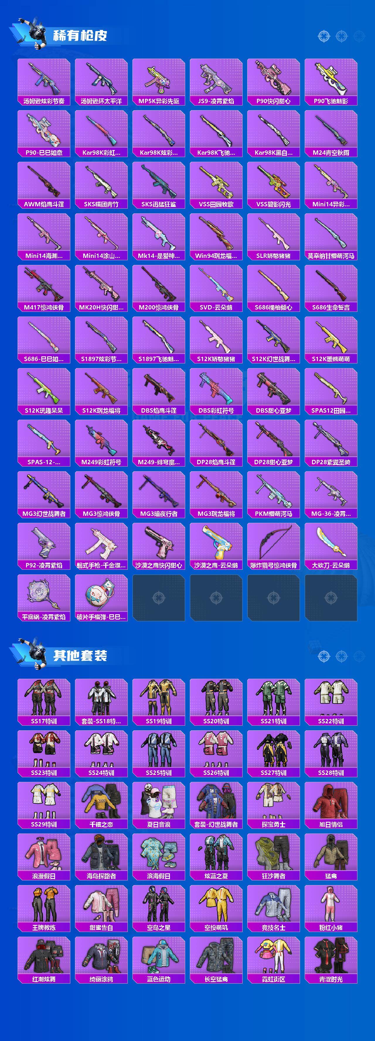 【粉色枪皮等级】:AKM-梦之光华(五级),AKM-星际浪客(七级),SCAR-L-锦绣绵绵(五级),M416-五爪金龙(四级),M416-超新星(三级),M762-冷魅冰骑(五级),Kar98K-巳巳如意(五级),DP-28-千金淑猫(六级),DP-28-