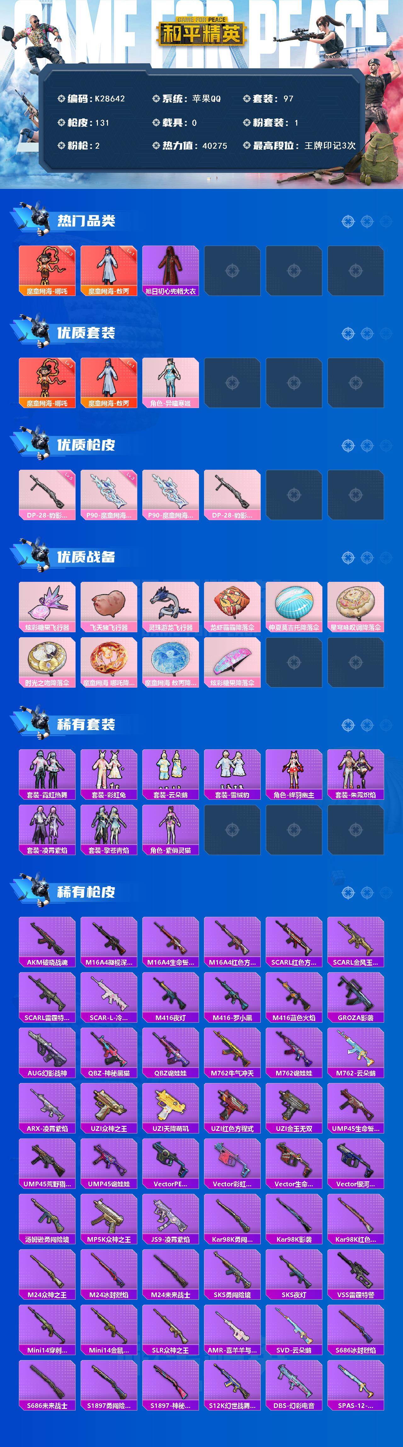 苹果 手Q-2神装-1粉装-2特效枪-0载具-4粉色飞行器-40275热力值-3王牌印记-97套装-131枪皮