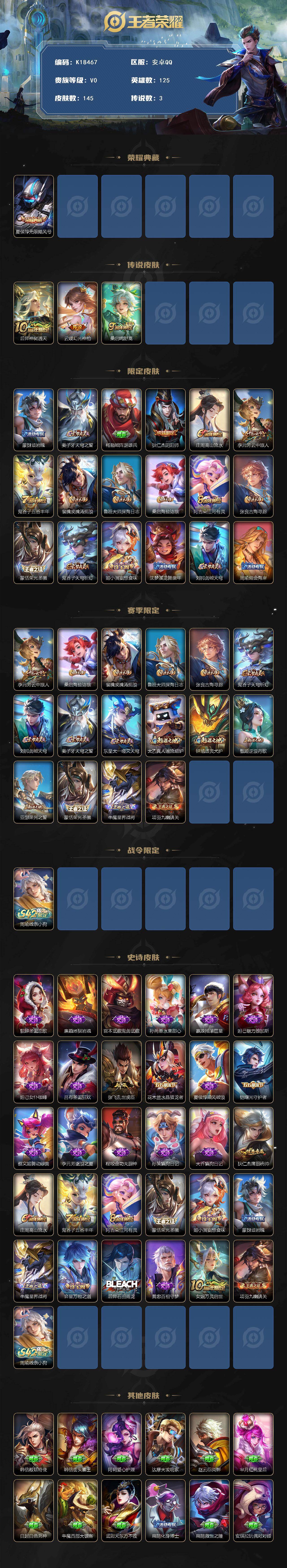 安卓Q-V0-至尊星耀II段位-125英雄-145皮肤-1典藏皮肤-3传说-30史诗