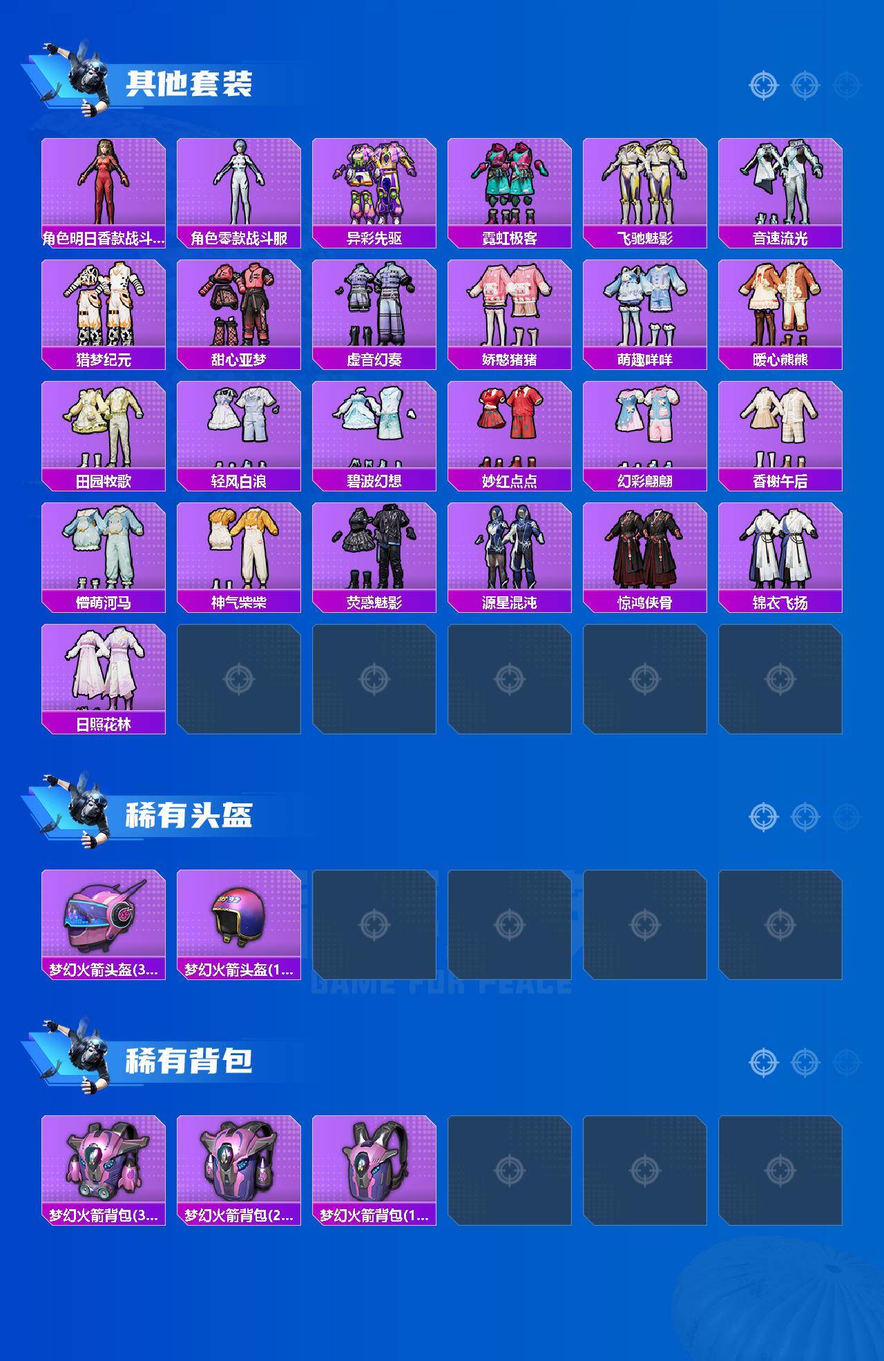 【粉色套装】:粉装-梦幻火箭,角色-2号机款机体服,角色-复仇流浪者,粉装-青空秋雨,粉装-莲影清波