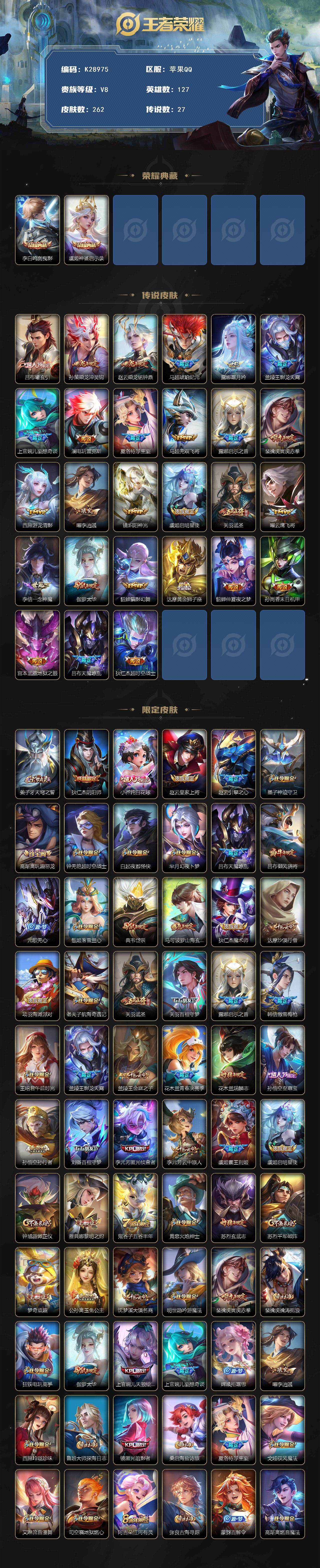 苹果Q-V8-至尊星耀IV段位-127英雄-262皮肤-2典藏皮肤-27传说-70史诗