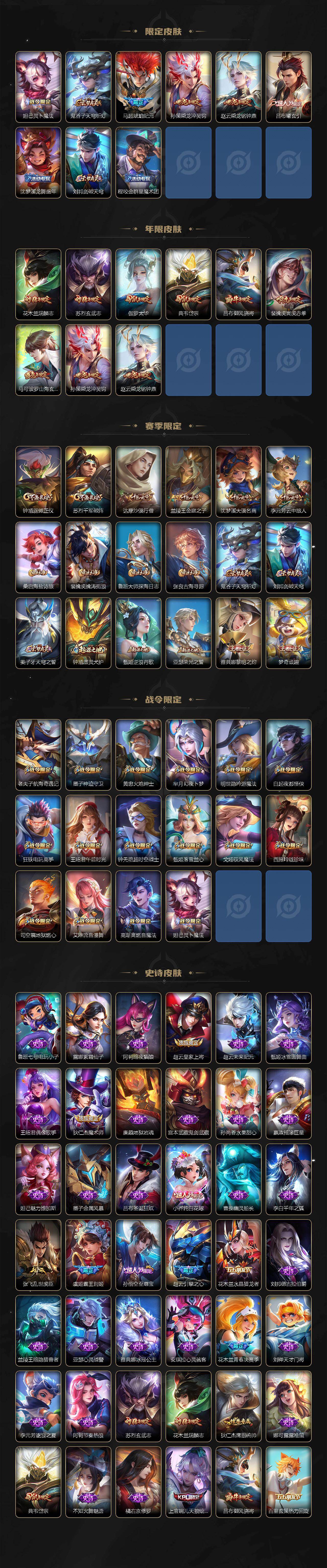 【传说皮肤】:吕布曦玄引,孙策乘龙淬吴钩,赵云乘龙铭钟鼎,马超琥珀纪元,露娜霜月吟,兰陵王影龙天霄,上官婉儿妄想奇谈,澜电玩雷克斯,夏洛特浮生妄,马超无双飞将,露娜启示之音,裴擒虎寅虎赤拳,西施游龙清影,曜李逍遥 ,镜炽阳神光,虞姬启明星使,关羽武圣,曜云鹰飞将,李信一念神魔,伽罗太华,貂蝉猫影幻舞,达摩黄金狮子座,貂蝉仲夏夜之梦,孙尚香末