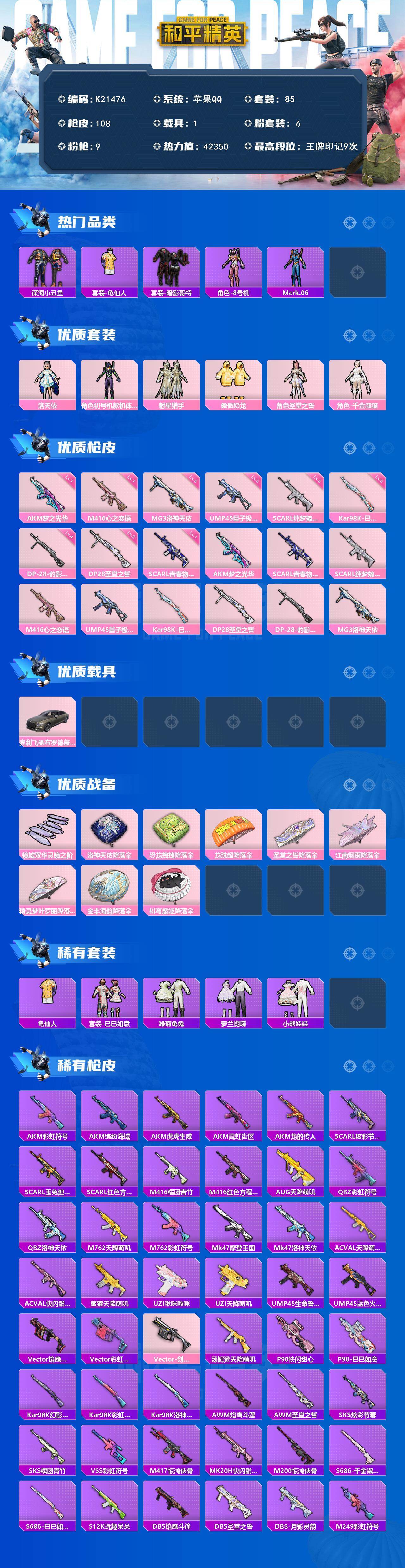 苹果 手Q-6粉装-9特效枪-1载具-1粉色飞行器-42350热力值-9王牌印记-85套装-108枪皮
