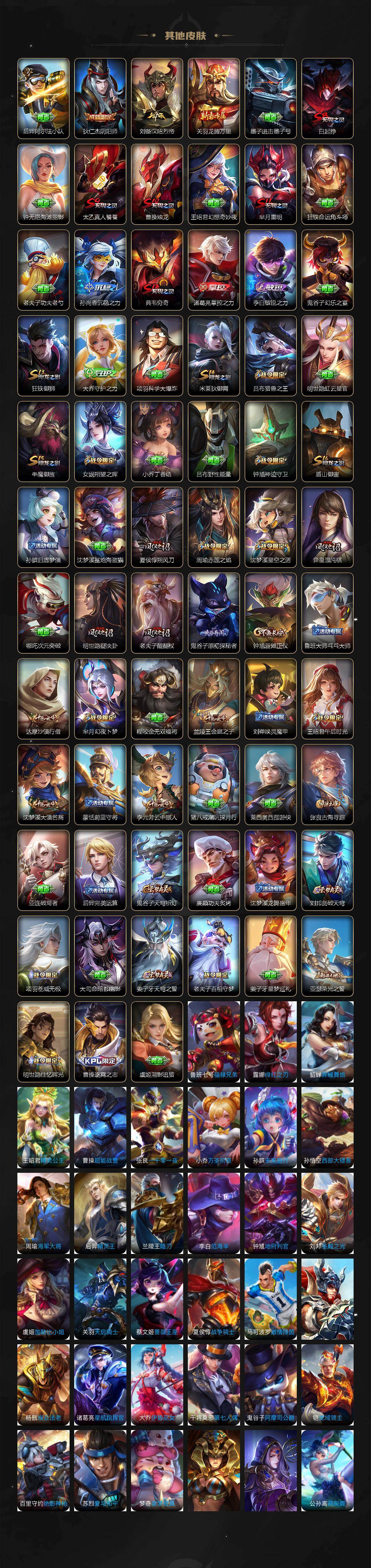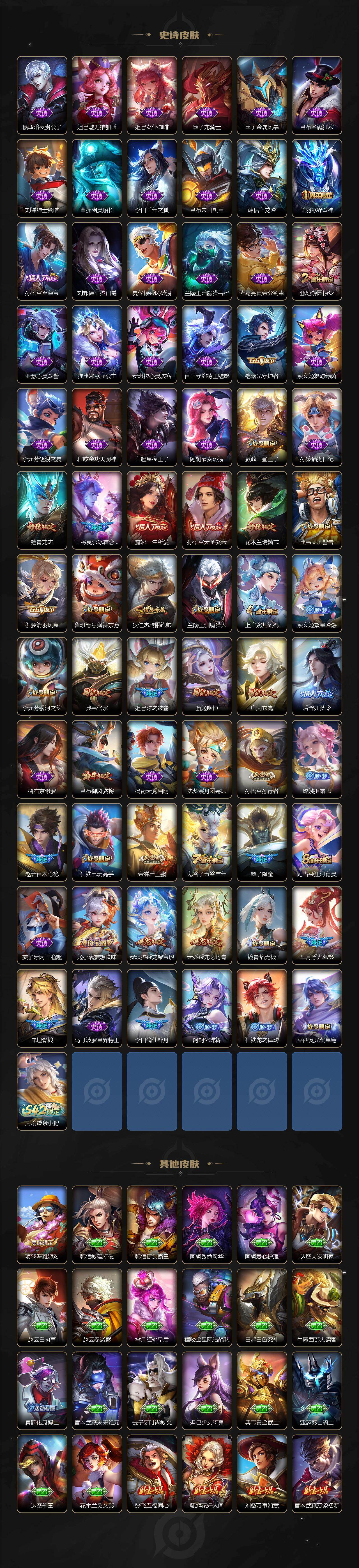 【传说皮肤】:夏侯惇霜北刀,海月金乌负日,孙尚香乘龙问璇玑,孙策乘龙淬吴钩,赵云乘龙铭钟鼎,鲁班七号时之奇旅,宫本武藏惊梅引,王昭君星穹之声,橘右京枫霜尽,娜可露露前尘镜,露娜启示之音,赵云淬星耀世,虞姬启明星使,伽罗太华,貂蝉猫影幻舞,干将莫邪久胜战神,虞姬云霓雀翎,达摩黄金狮子座,百里玄策白虎志,后羿黄金射手座,诸葛亮武陵仙君,貂蝉仲夏夜之