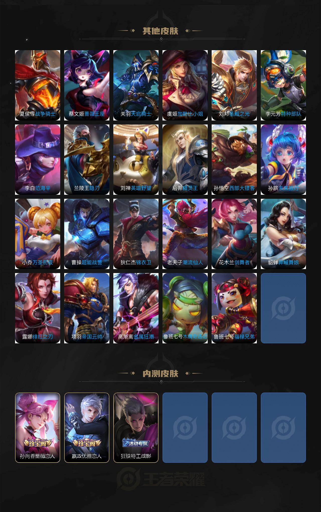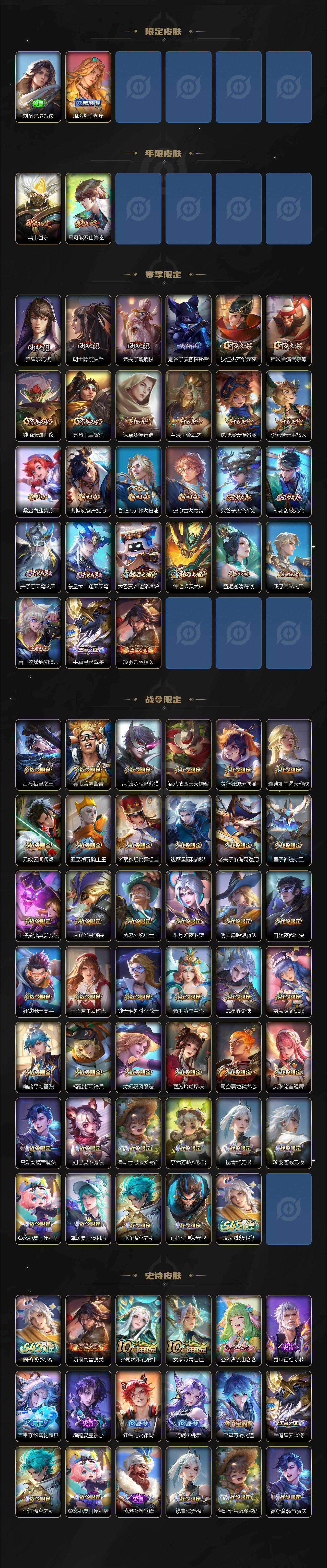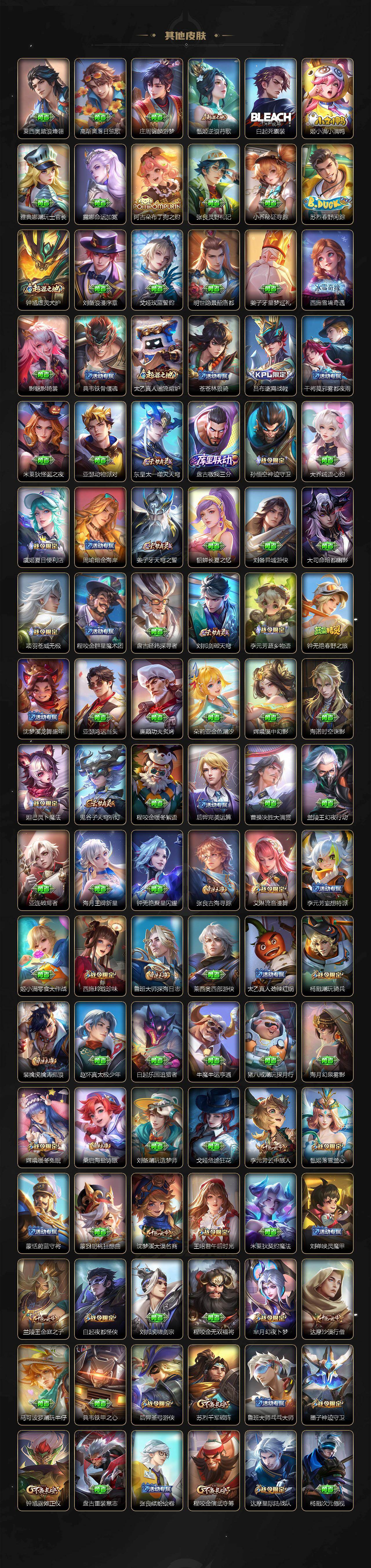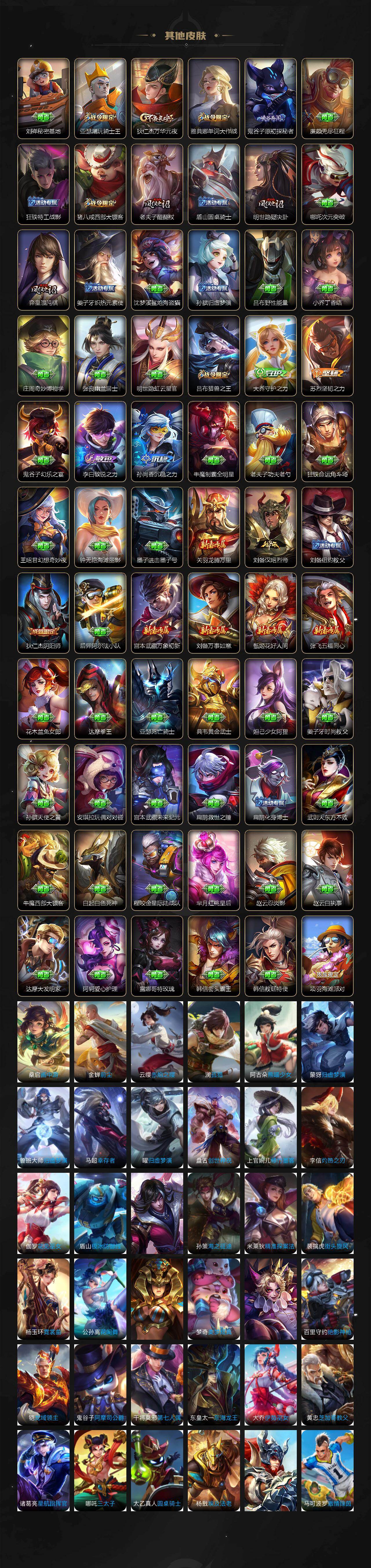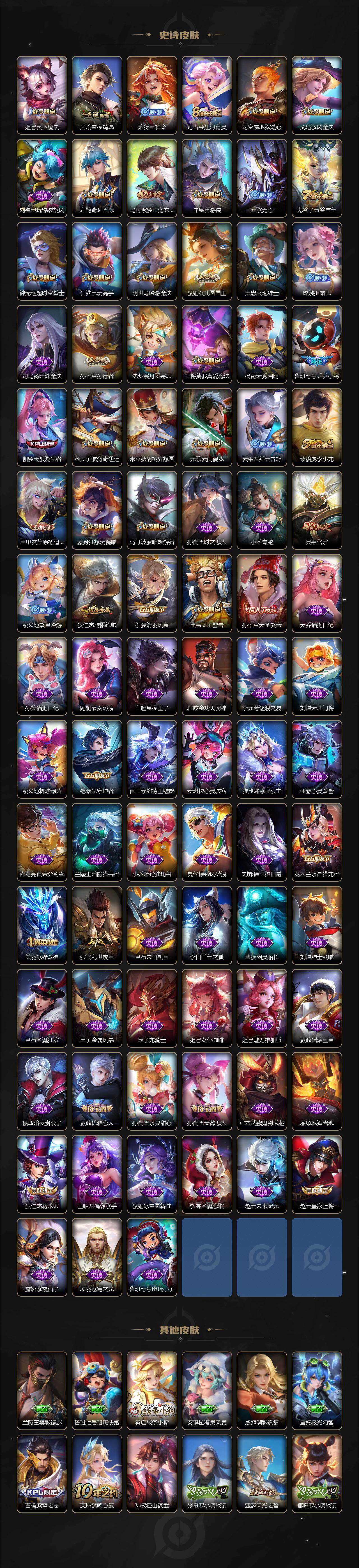 【限定皮肤】:蔡文姬夏日便利店,大乔绒语心约,虞姬夏日便利店,姜子牙天穹之誓,狄仁杰阴阳师,赵云皇家上将,墨子神迹守卫,嬴政优雅恋人,孙尚香蔷薇恋人,鲁班七号乒乒小将,钟无艳超时空战士,扁鹊奇幻香踪,白
