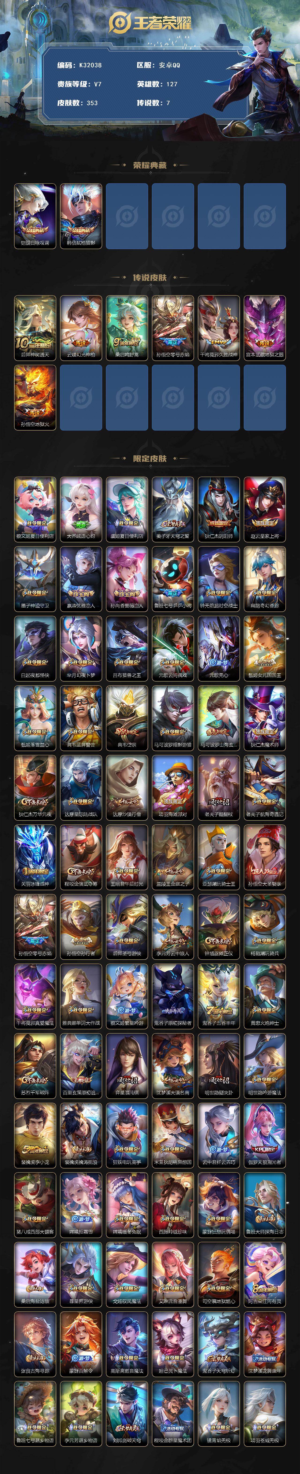 安卓Q-V7-最强王者段位-127英雄-353皮肤-2典藏皮肤-7传说-103史诗