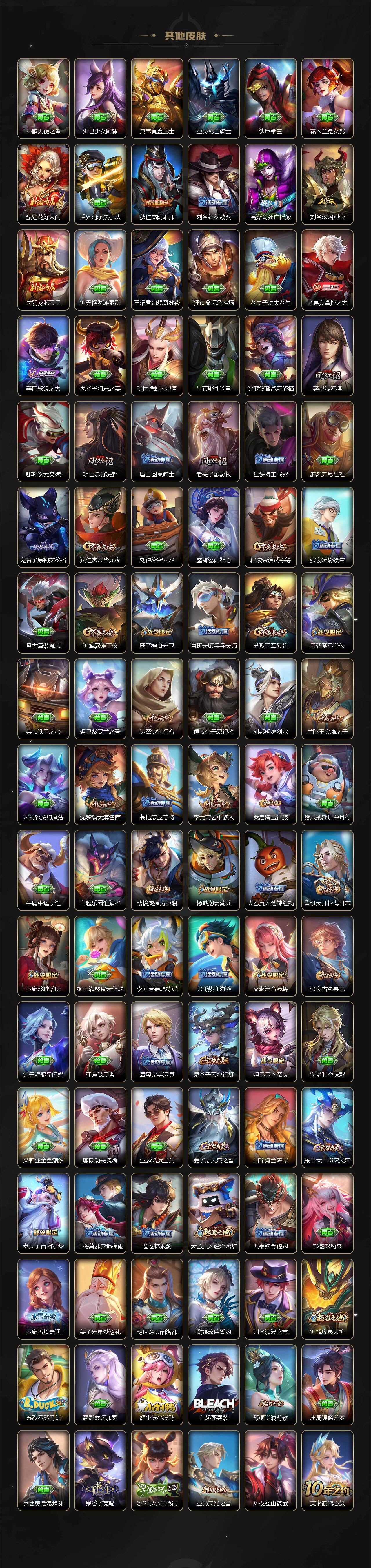 【限定皮肤】:姜子牙天穹之誓,狄仁杰阴阳师,赵云皇家上将,墨子神迹守卫,嬴政白昼王子,庄周高山流水,高渐离死亡摇滚,钟无艳王者之锤,