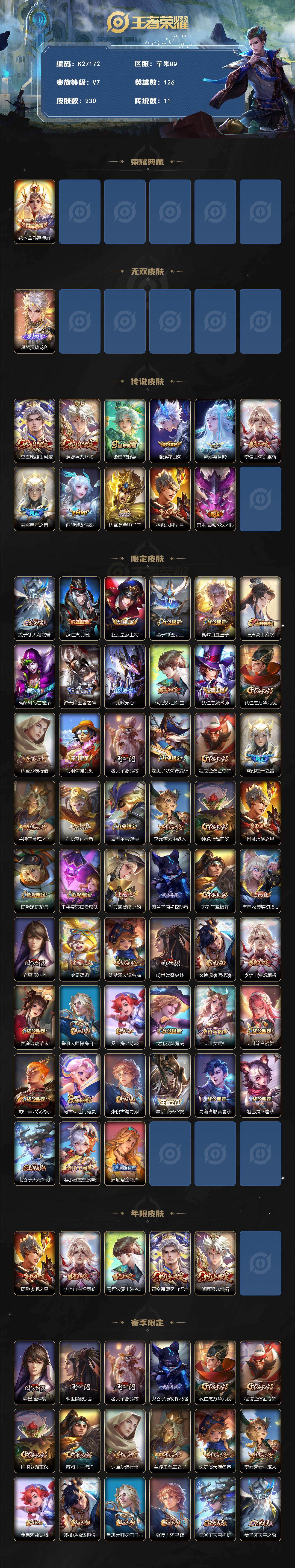苹果Q-V7-最强王者段位-126英雄-230皮肤-1典藏皮肤-1无双-11传说-58史诗