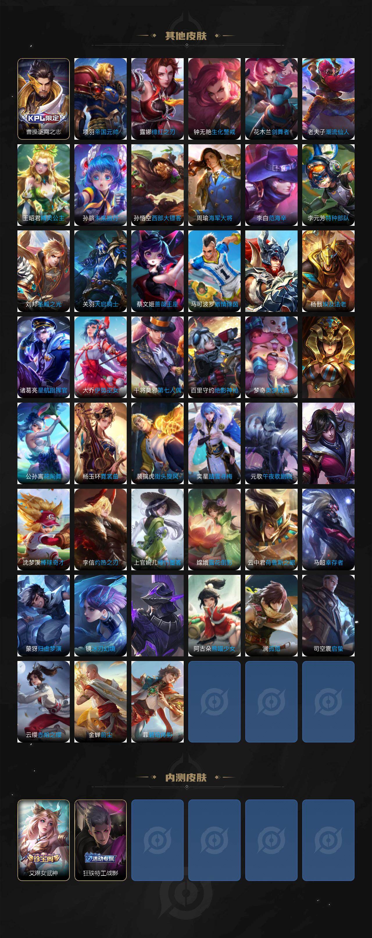 【传说皮肤】:司空震愿照山河定,澜愿照九州拓,桑启鸣野蒿,澜逐花归海,露娜霜月吟,李信山海炽霜斩,露娜启示之音,西施游龙清影,达摩黄金狮子座,杨戬永曜之星,宫本武藏地狱之眼