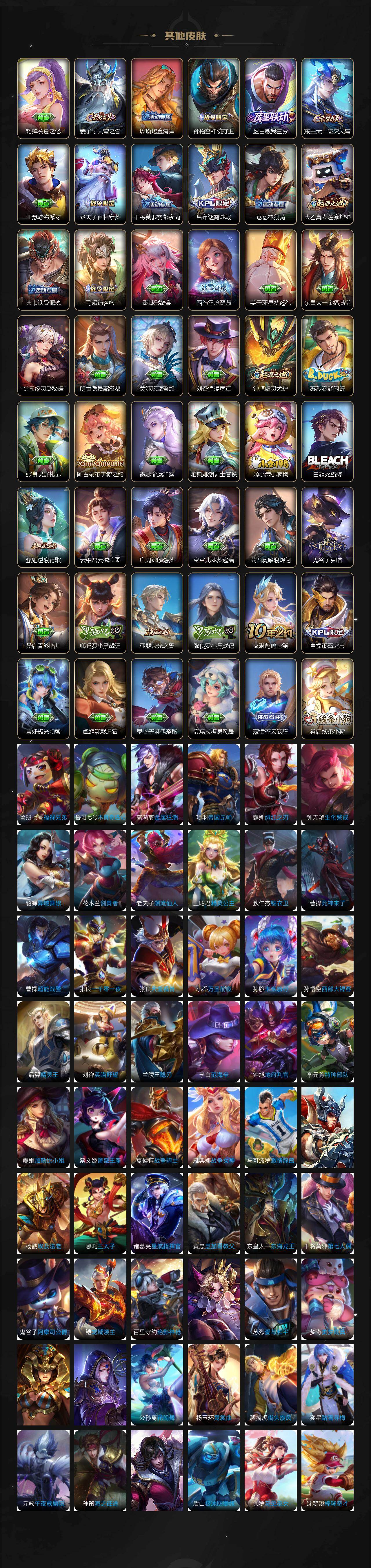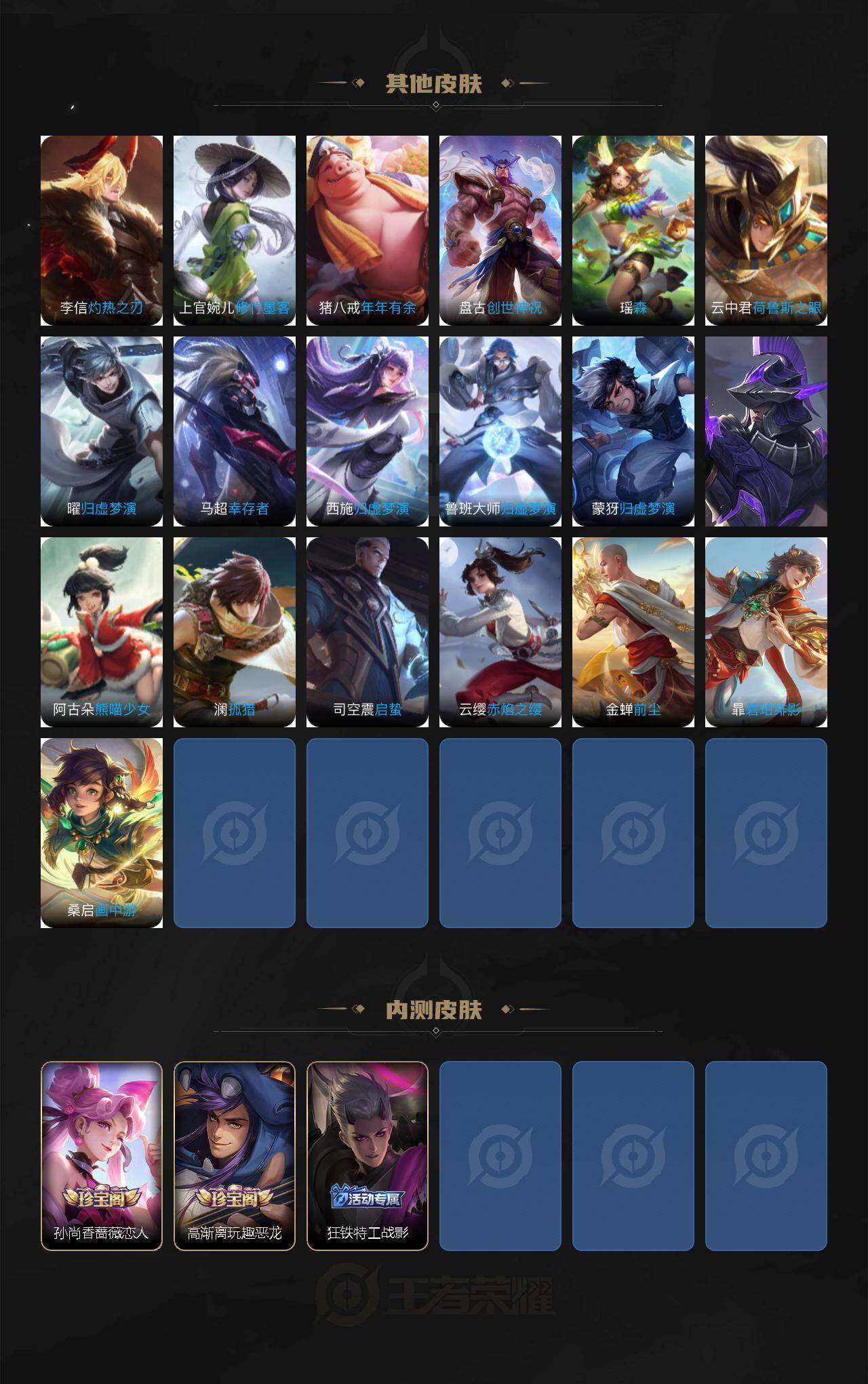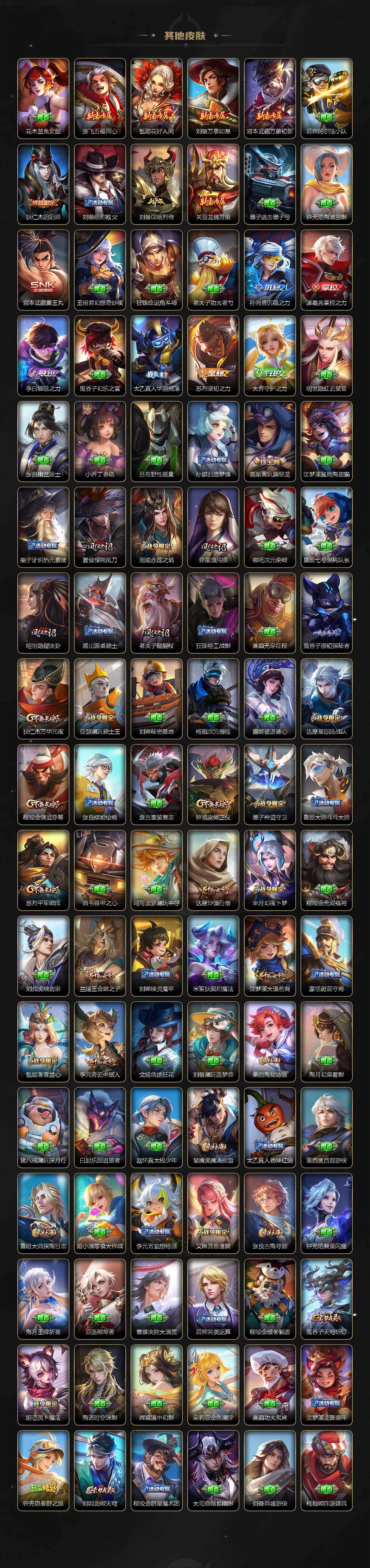 【传说皮肤】:司空震愿照山河定,澜愿照九州拓,裴擒虎祥瑞亨通,桑启鸣野蒿,曜李逍遥 ,诸葛亮时雨天司,铠绛天战甲,虞姬启明星使,曜云鹰飞将,李信一念神魔,刘备时之恋人,张良黄金白羊座,干将莫邪久胜战神,达摩黄金狮子座,后羿黄金射手座,宫本武藏地狱之眼