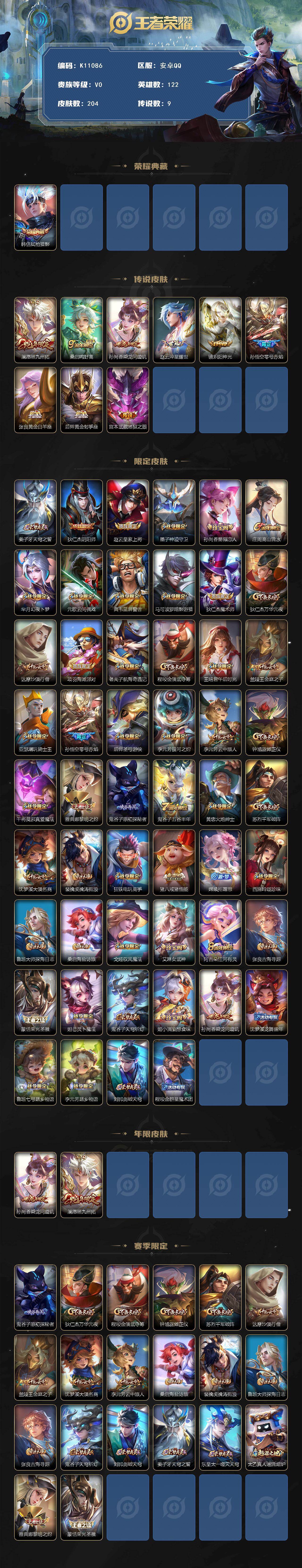 安卓Q-V0-尊贵铂金II段位-122英雄-204皮肤-1典藏皮肤-9传说-55史诗