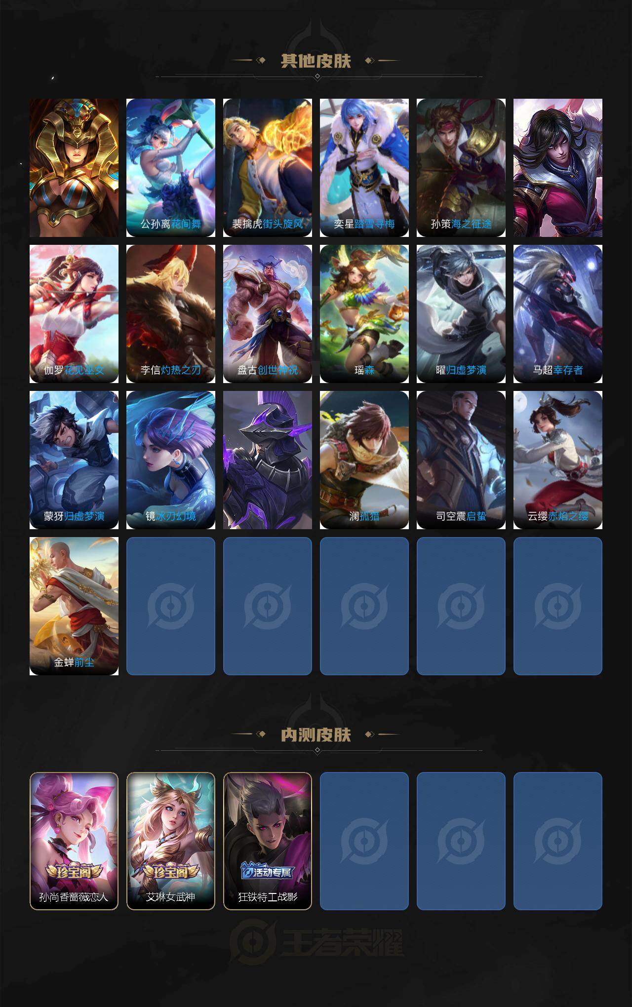 【传说皮肤】:澜愿照九州拓,桑启鸣野蒿,孙尚香乘龙问璇玑,赵云淬星耀世,镜炽阳神光,孙悟空零号赤焰,张良黄金白羊座,后羿黄金射手座,宫本武藏地狱之眼