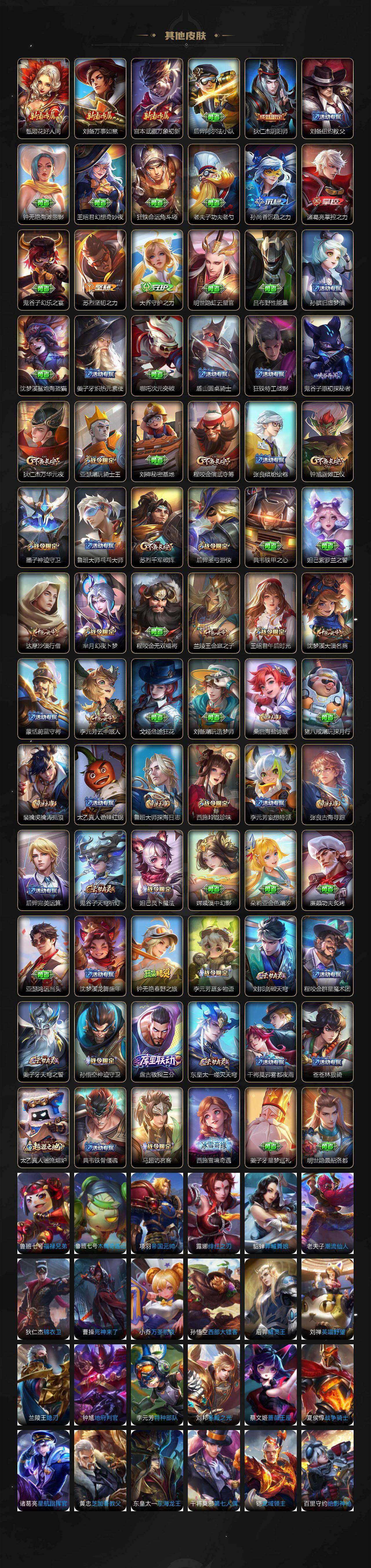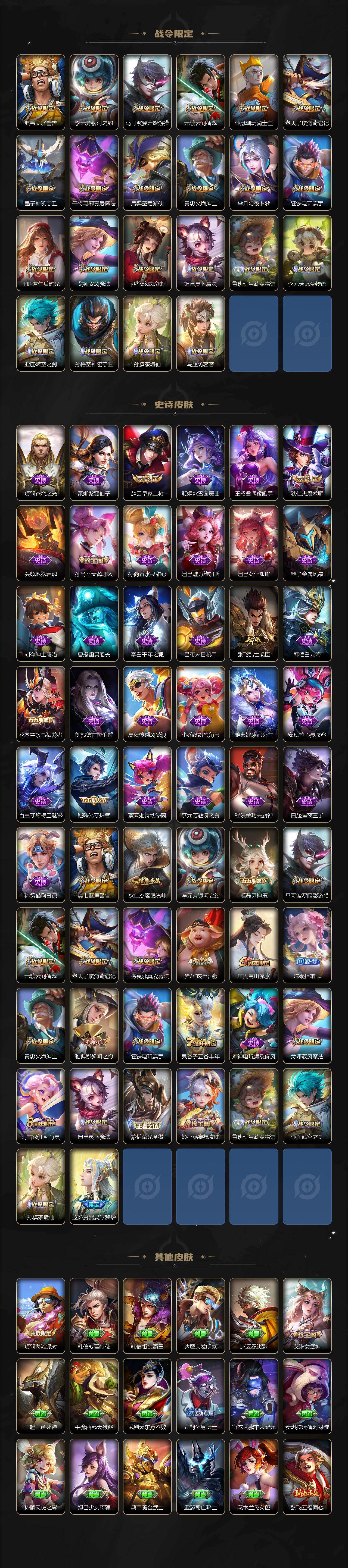 【限定皮肤】:姜子牙天穹之誓,狄仁杰阴阳师,赵云皇家上将,墨子神迹守卫,孙尚香蔷薇恋人,庄周高山流水,芈月幻夜卜梦,元歌云间偶戏,典韦蓝屏警告,马可波罗暗影游猎,狄仁杰魔术师,狄仁杰万华元夜,达摩沙漠行僧,项羽海滩派对,老夫子航海奇遇记