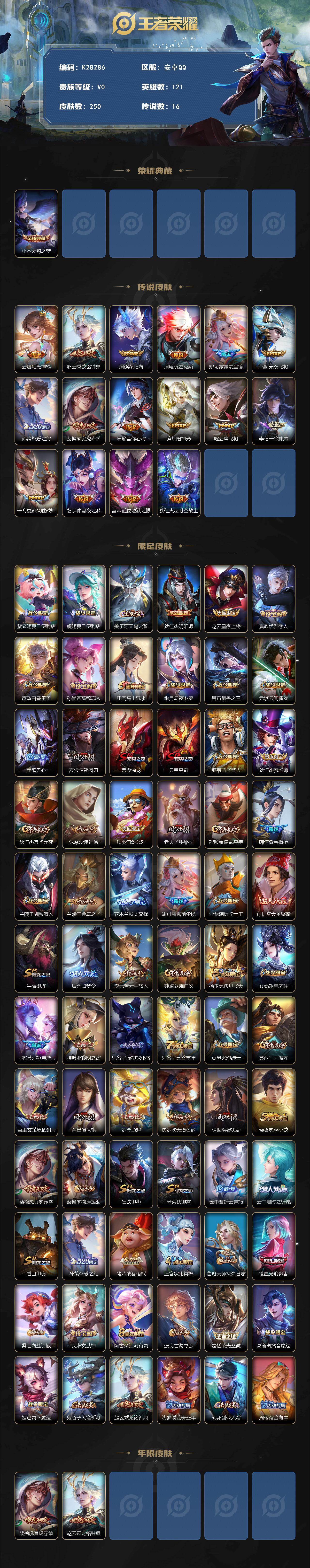 安卓Q-V0-最强王者段位-121英雄-250皮肤-1典藏皮肤-16传说-67史诗
