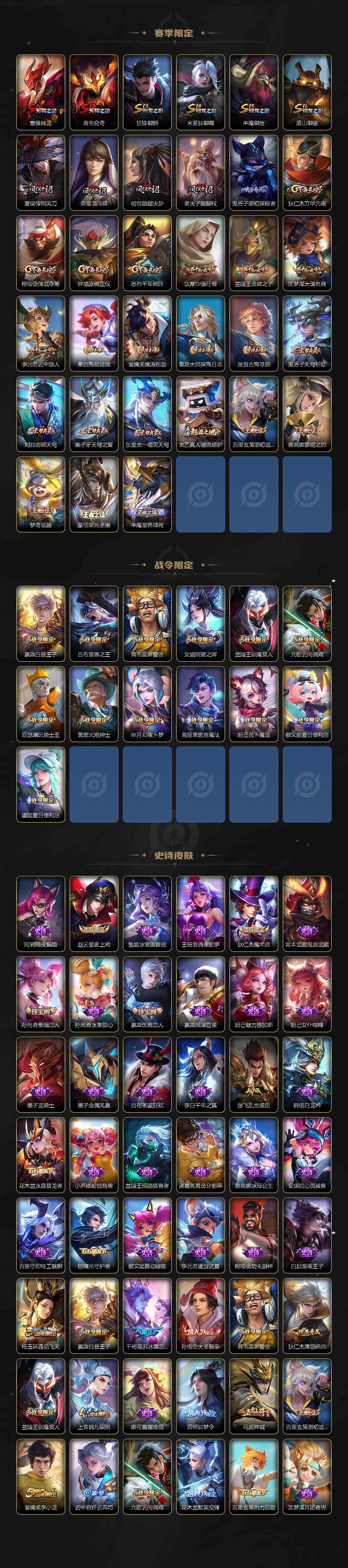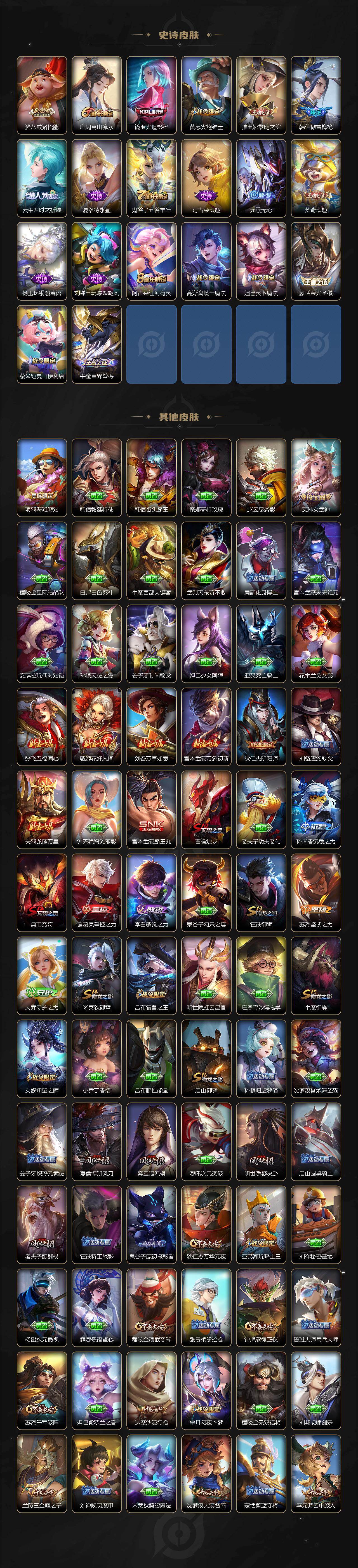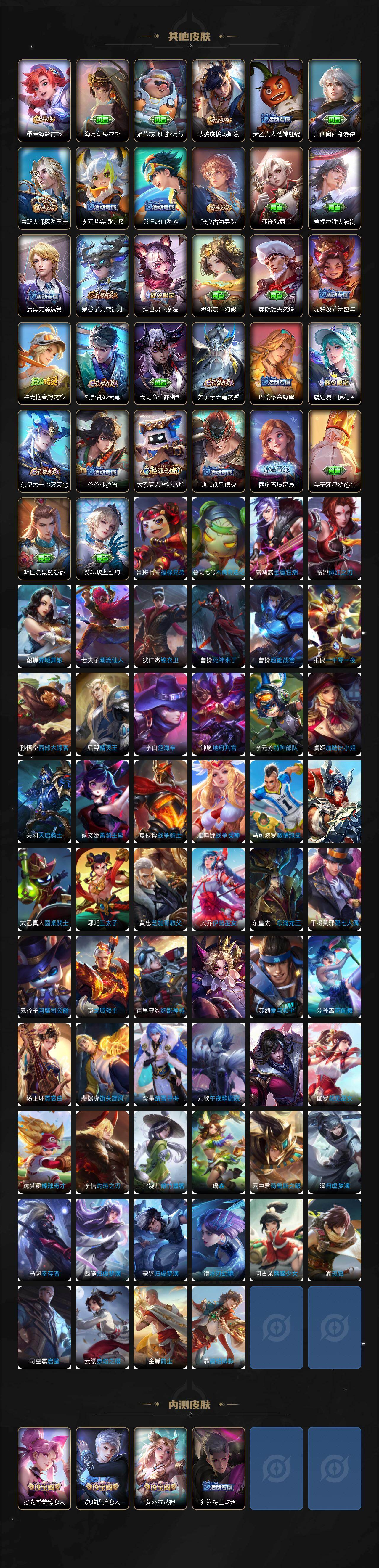 【传说皮肤】:云缨幻光神枪,赵云乘龙铭钟鼎,澜逐花归海,澜电玩雷克斯,娜可露露前尘镜,马超无双飞将,孙策挚爱之约,裴擒虎寅虎赤拳,周瑜音你心动,镜炽阳神光,曜云鹰飞将,李信一念神魔,干将莫邪久胜战神,貂蝉仲夏夜之梦,宫本武藏地狱之眼,狄仁杰超时空战士