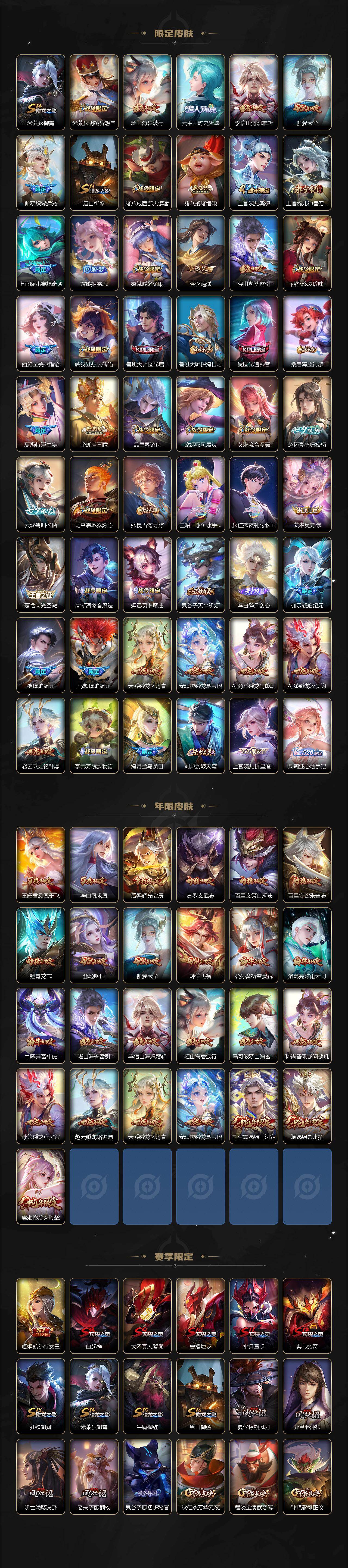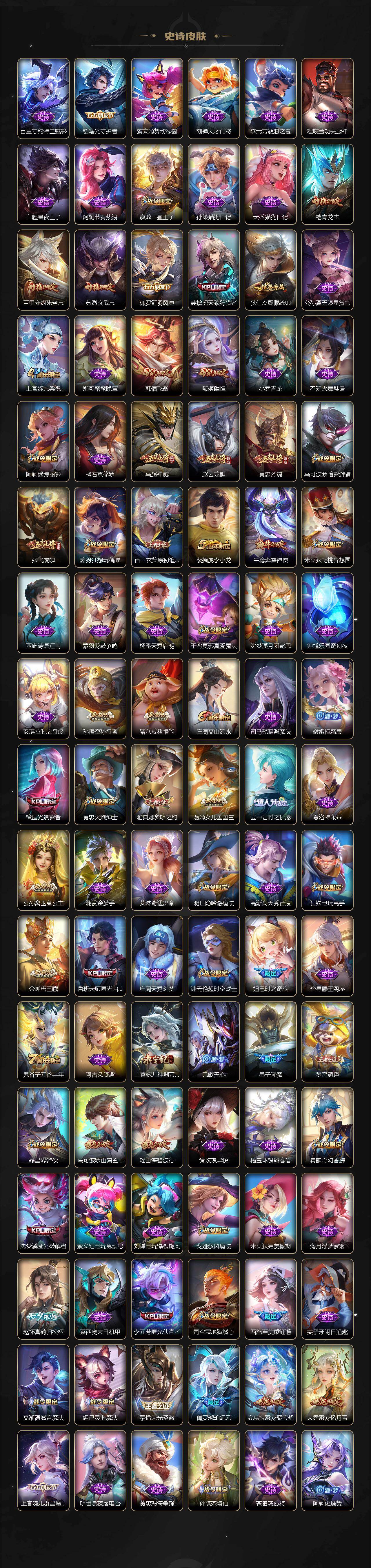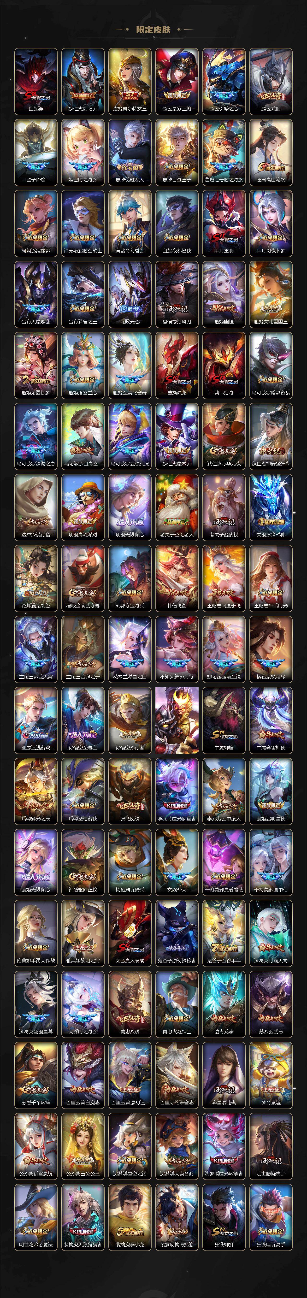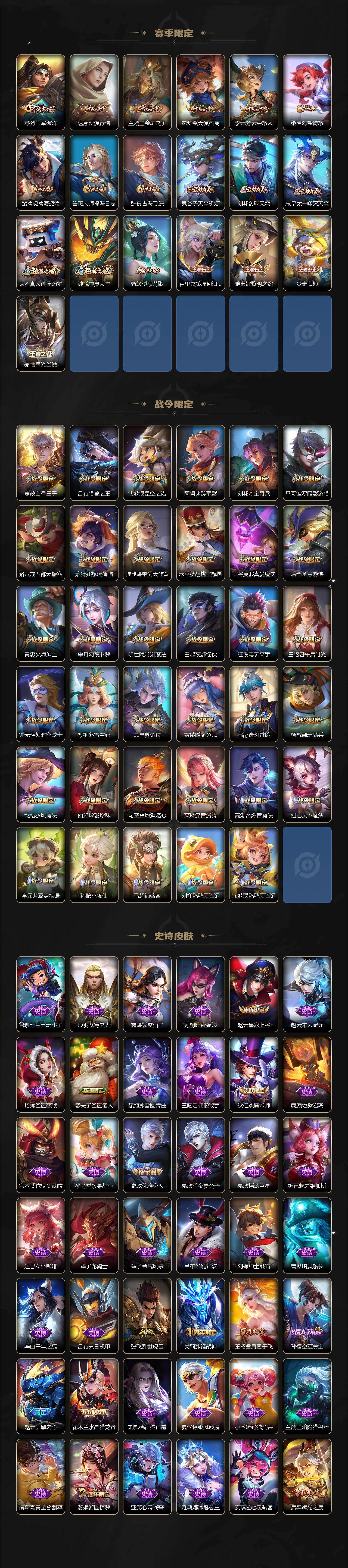 【英雄全皮】:刘禅全皮,阿轲全皮,武则天全皮,娜可露露全皮,橘右京全皮,苏烈全皮,狂铁全皮,猪八戒全皮,鲁班大师全皮,澜全皮,夏洛特全皮,司空震全皮,金蝉全皮,戈娅全皮,影全皮