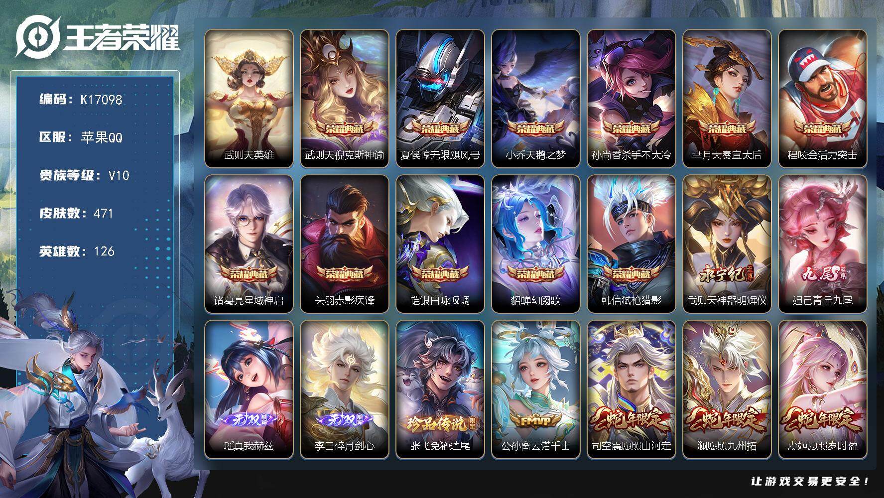 苹果Q-V10-至尊星耀III段位-126英雄-471皮肤-11典藏皮肤-1典藏